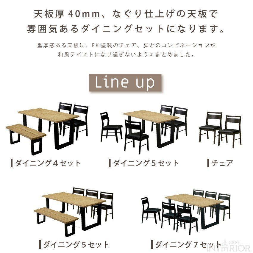 | 和モダンテイストのダイニングセット。黒脚に厚天板の天然木のコントラストがおしゃれ感を増幅します。手触りがとても滑らかで、優しく穏やかな印象の木目が特徴です。固く高強度な木材なので、長年使用できる耐久性があります。ほっとするような安心感を与えてくれます。サイズバリエーションも豊富にそろえております! |