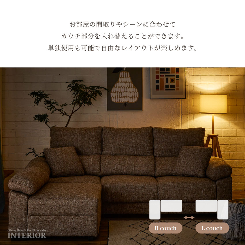 | レイアウトが自由に楽しめる、多機能のカウチソファです。オットマンを切り離したり、カウチを左右入れ替えたり…お部屋の雰囲気やシーンに合わせてお使いいただけます。背もたれにはギア式の10段階リクライニング機能が備わっており、お好きな角度でリラックスできます。 |