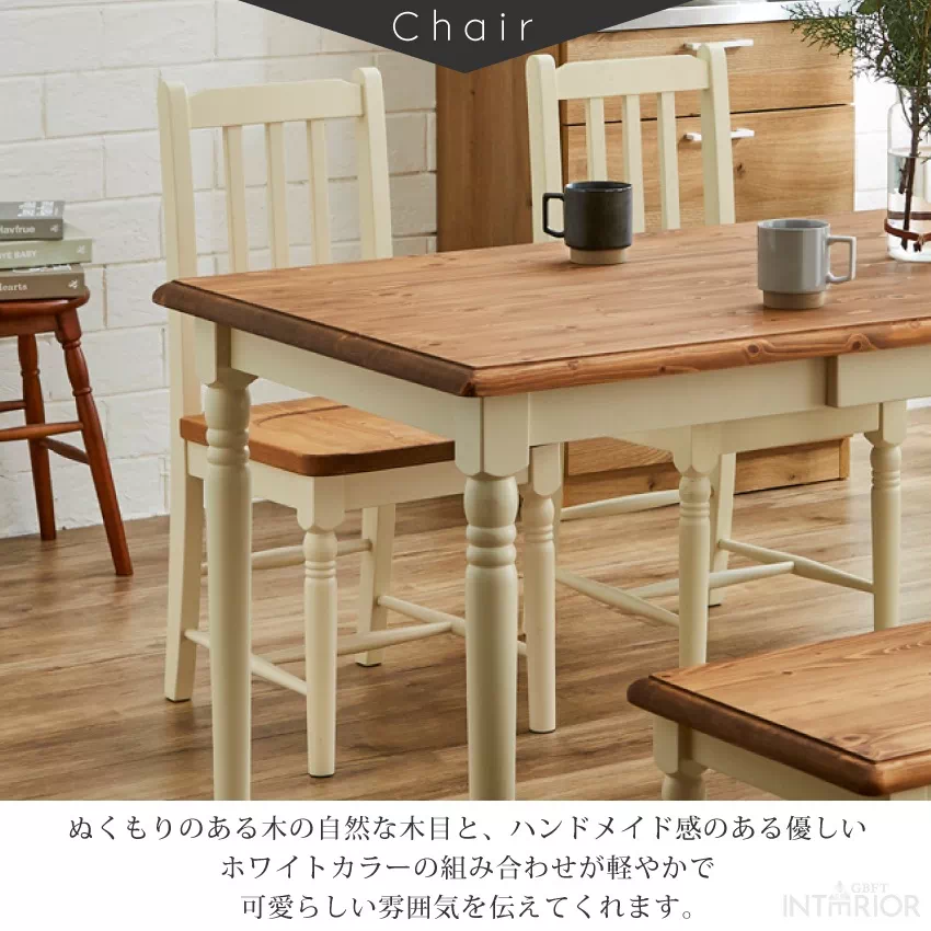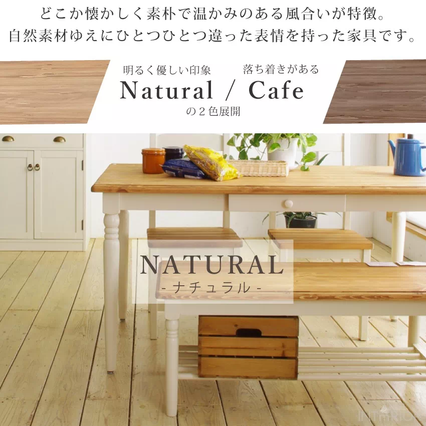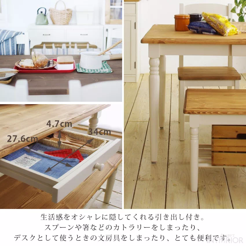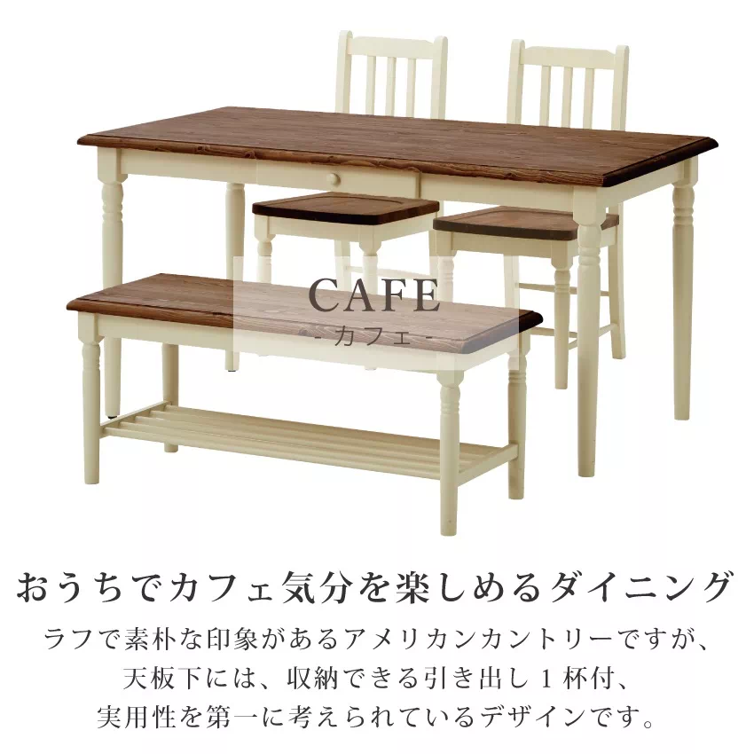 | カフェのような雰囲気!アメリカンカントリー調のデザインが可愛らしいダイニング4点セットです。ぬくもりのある柔らかな雰囲気でリビングを明るく彩ります。デザインだけでなく実用性も重視。テーブルには小物を収納できる引き出しが付いています。テーブル周りのちょっとしたアイテムを収納するのに便利です。 |