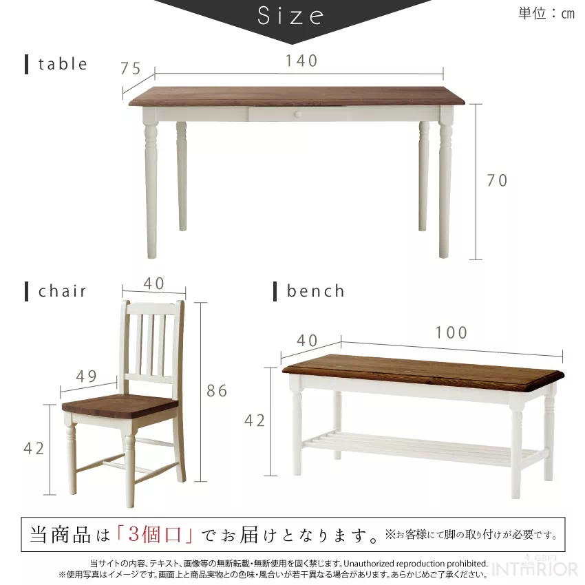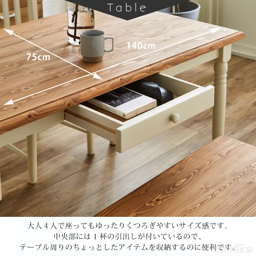 | テーブル:W140cm×D75cm×H70cm チェア :W40cm×D49cm×H86cm 座面:42cm ベンチ :W100cm×D40cm×H42cm 組立式、引き出し内寸:W34cm×D27.6cm×H4.7cm |