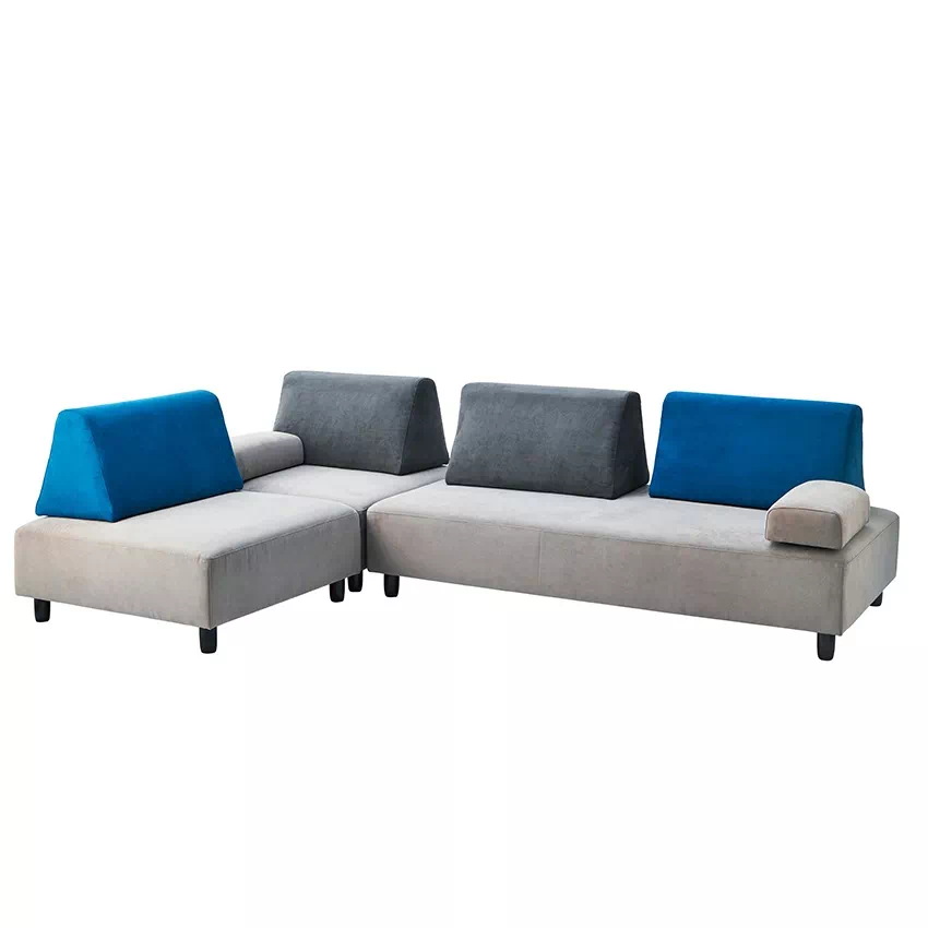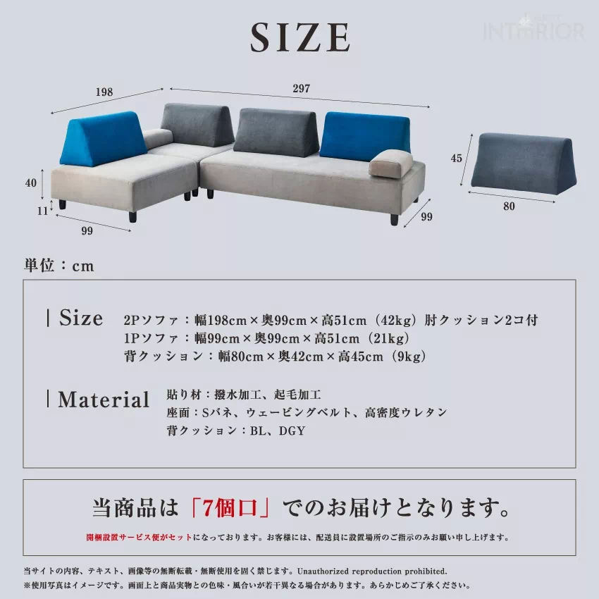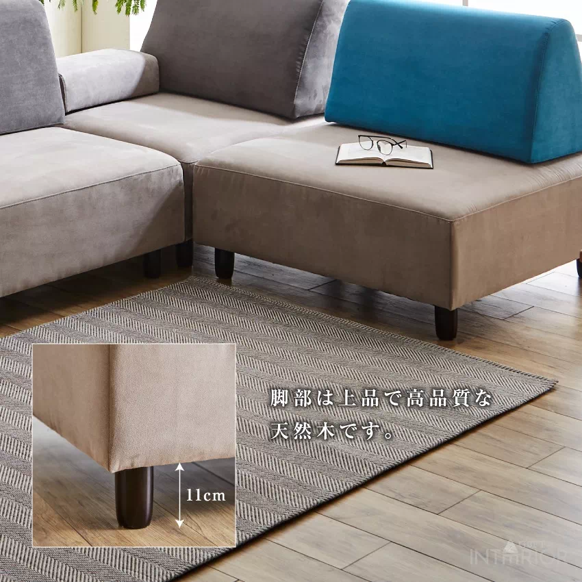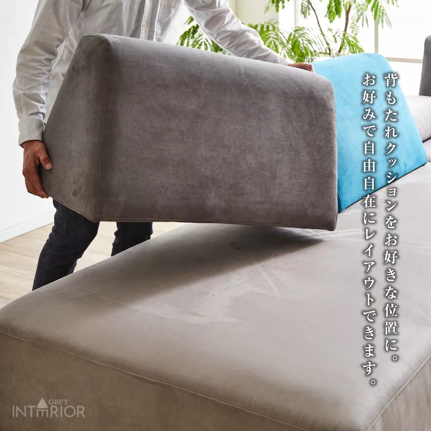 | レイアウト自由自在。どの方向からでも座れるソファセットです。ソファ本体とクッション、肘クッションがセットになっています。撥水加工が施されたファブリック素材を使用しているため、お手入れカンタン。クッション部分は少し硬めに設計されており、長時間座っていても疲れにくいです。 |
