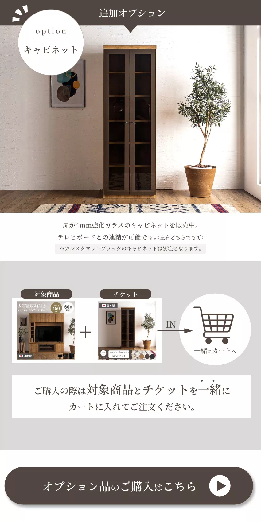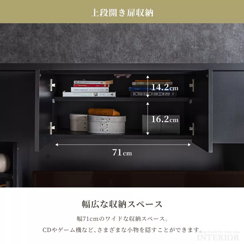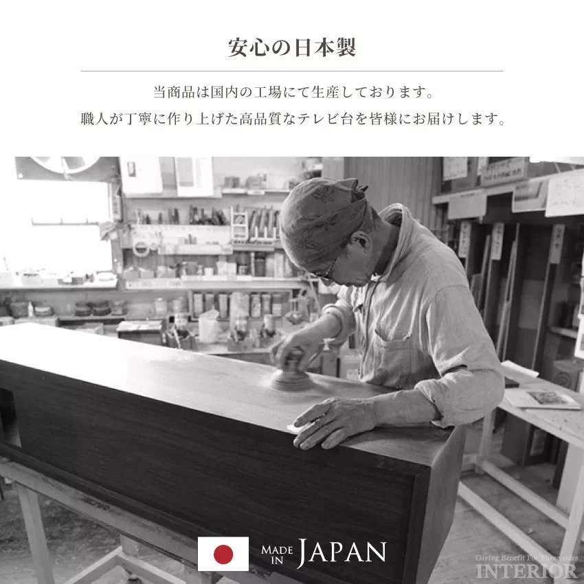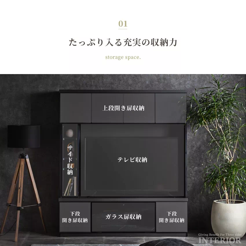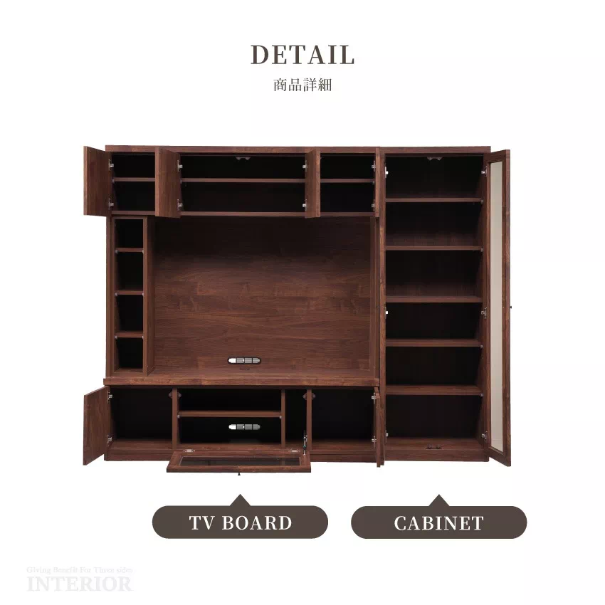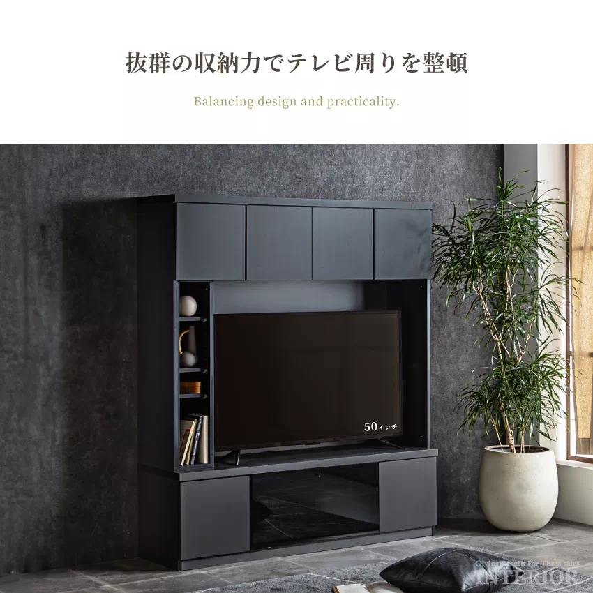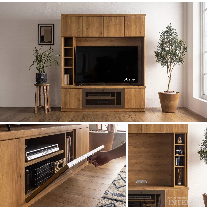 | 安心の国産テレビボードです。幅150cmのハイタイプで、60インチまで対応可能。テレビ周りには充実の収納機能を備え、リビングがすっきり片付きます。サイドには左右移動可能な棚がついており、好みに合わせて配置可能。オプションにて幅60cmのキャビネットをお選びいただけます。 |