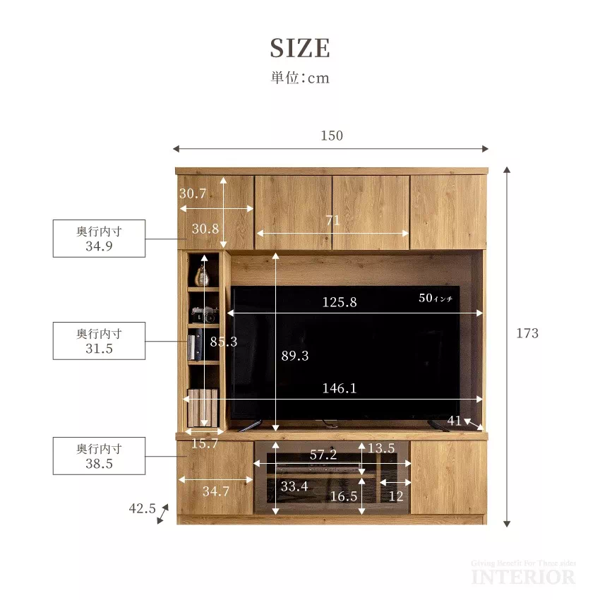 | テレビボード 幅150×奥行42.5×高さ173cm(60インチまで対応※棚ありの場合は50インチまで) キャビネット 幅60×奥行39×高さ173cm 梱包サイズ:上台152×40×133cm、下台152×43×42.5cm |