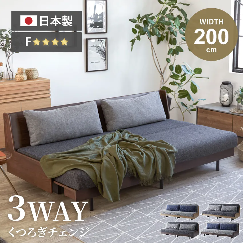 ソファベッド おしゃれ シングルサイズ ローソファ 家具 国産 おすすめ 3人掛け ごろ寝ベッド クッション 幅200cm 日本製 正規販売店 200cm 天然木 オーク材 新生活