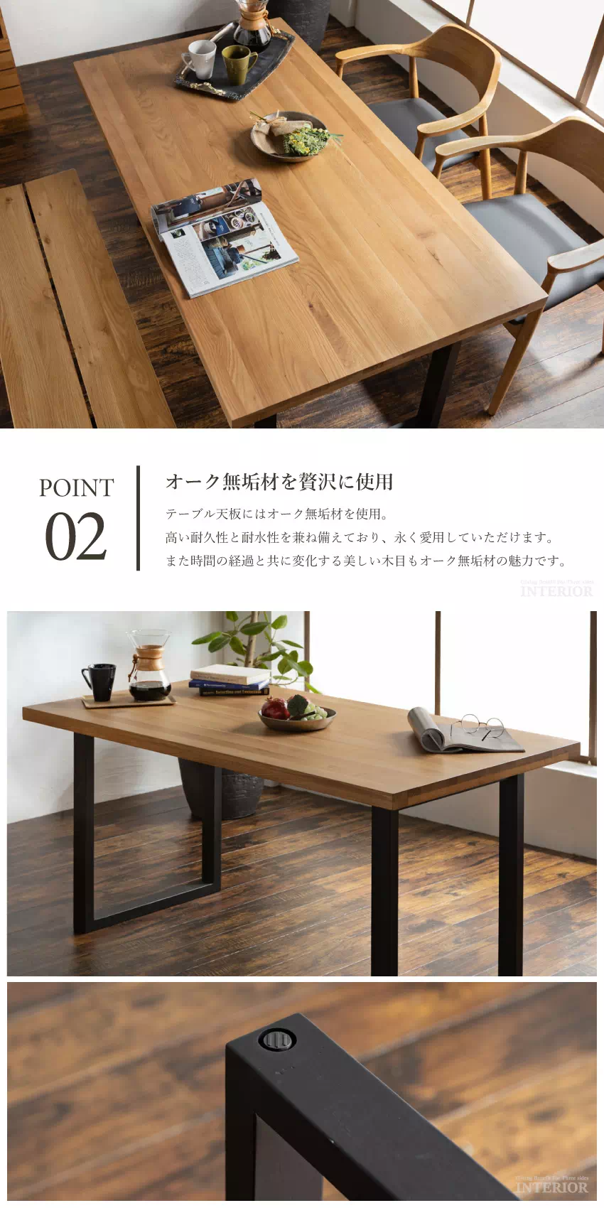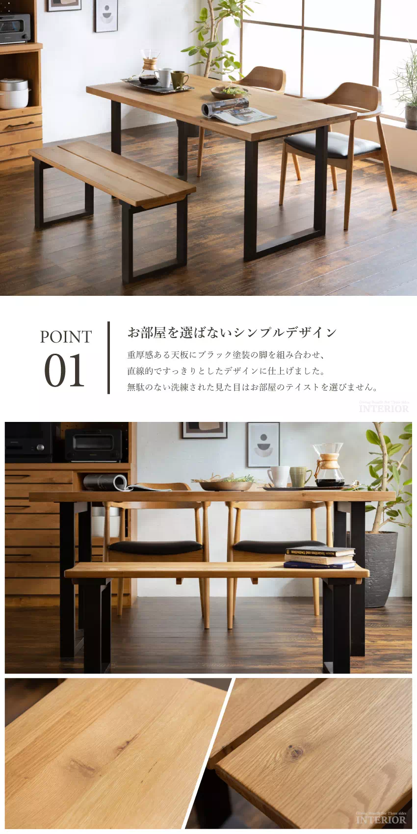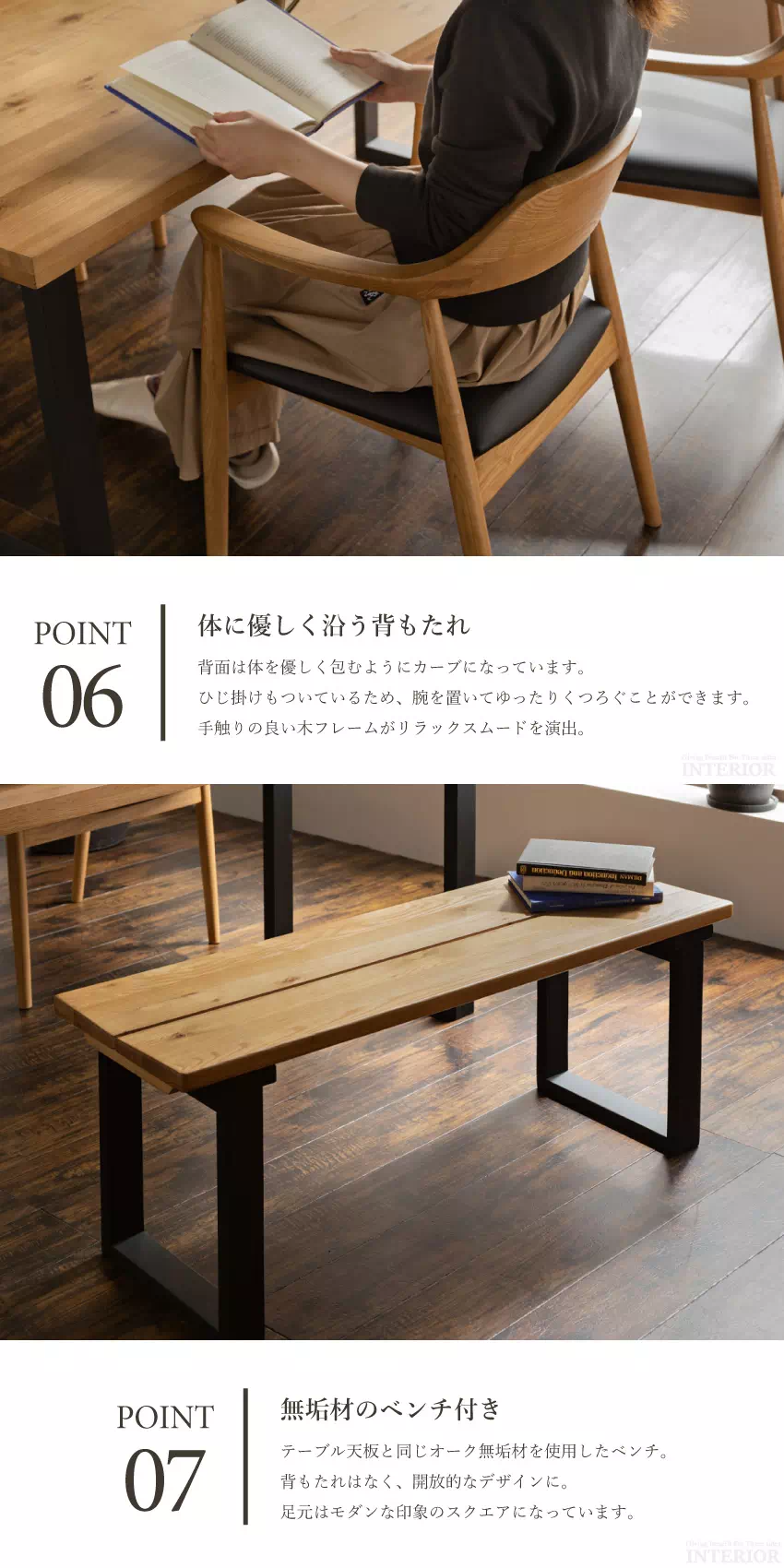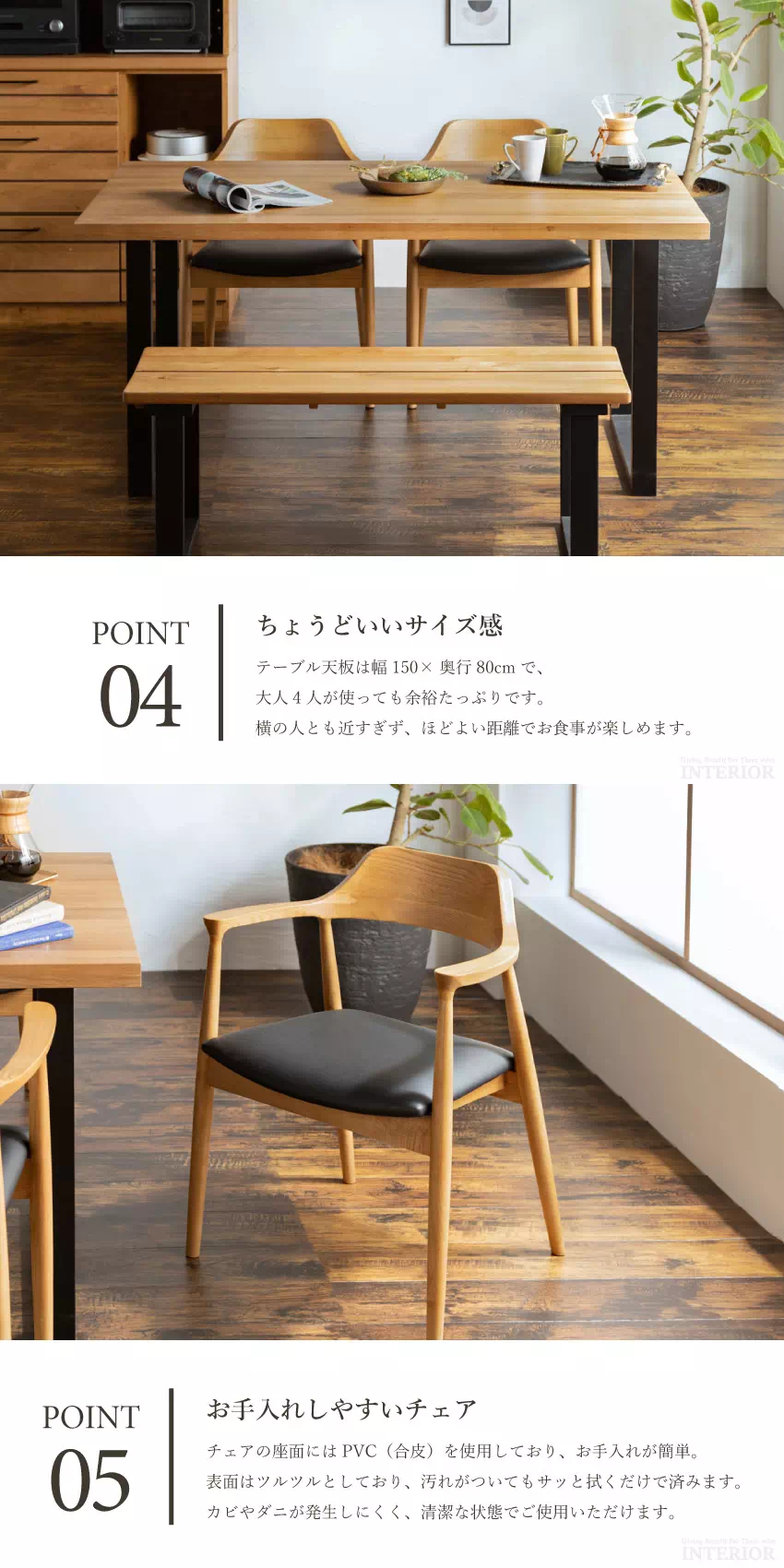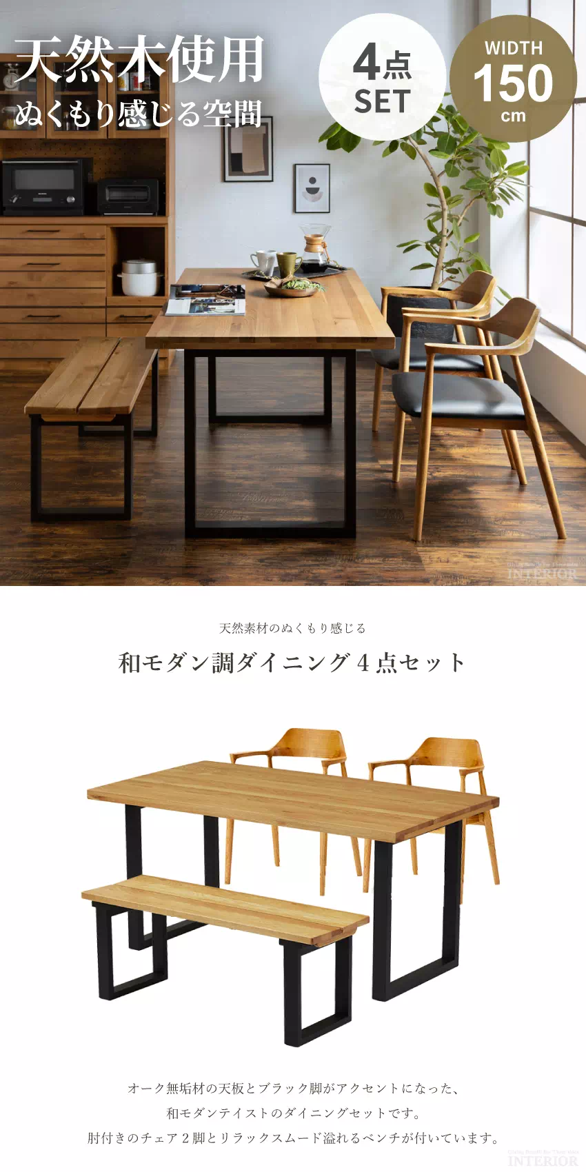 | 天然オーク無垢材とブラック脚がアクセントになった、和モダンテイストのダイニングセット。肘付きチェア2脚とリラックスムード溢れるベンチが1つ付いています。お部屋を選ばないシンプルなデザインで、永く愛用していただけます。チェア座面はPVC素材でお手入れも簡単! |