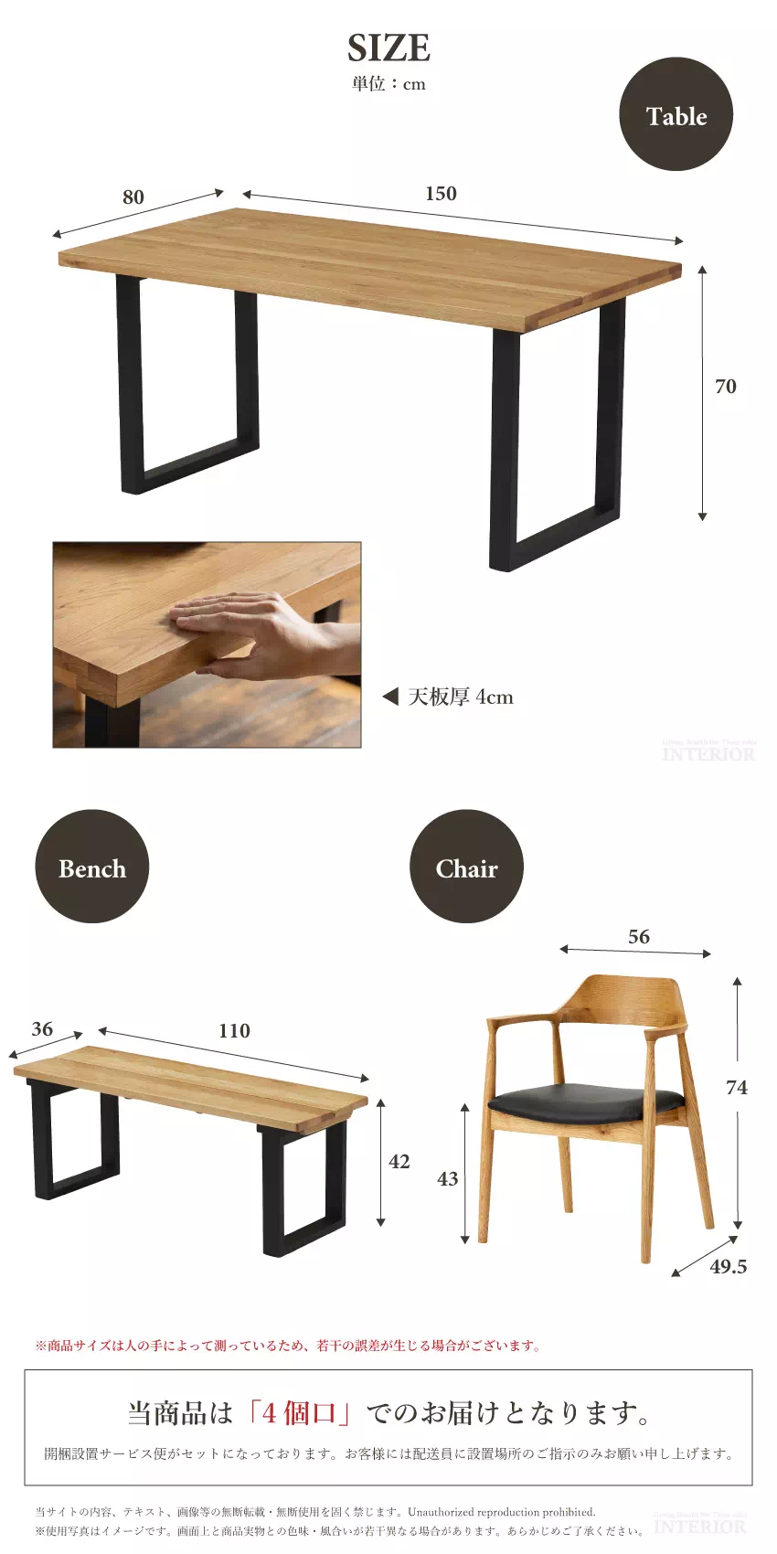 | テーブル:W150×D80×H70cm(天板厚4cm) チェア:W56×D49.5×H74(SH43)cm ベンチ:W110×D36×H42cm |