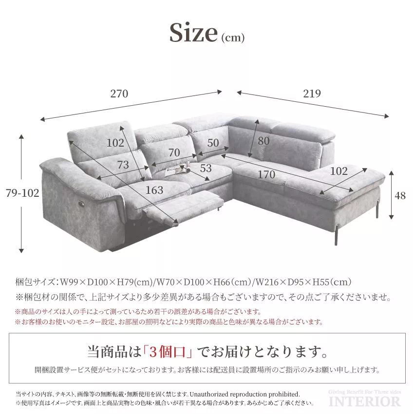 | W270×D219×H79~102×SH48(cm) 梱包サイズ:W99×D100×H79(cm)/W70×D100×H66(cm)/W216×D95×H55(cm) |
