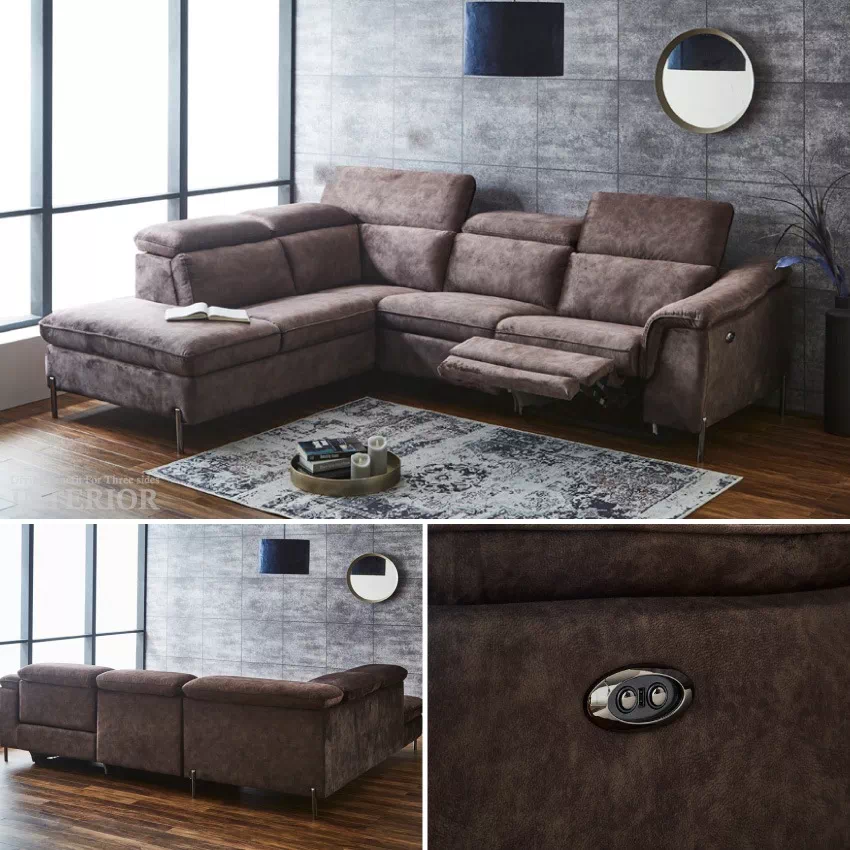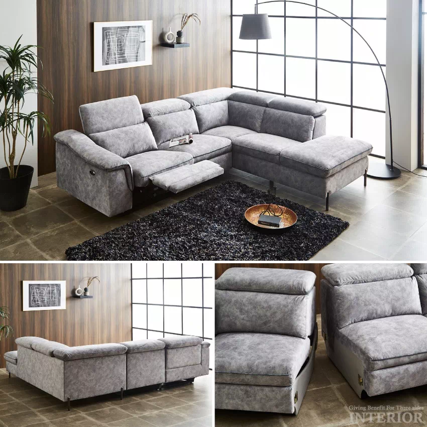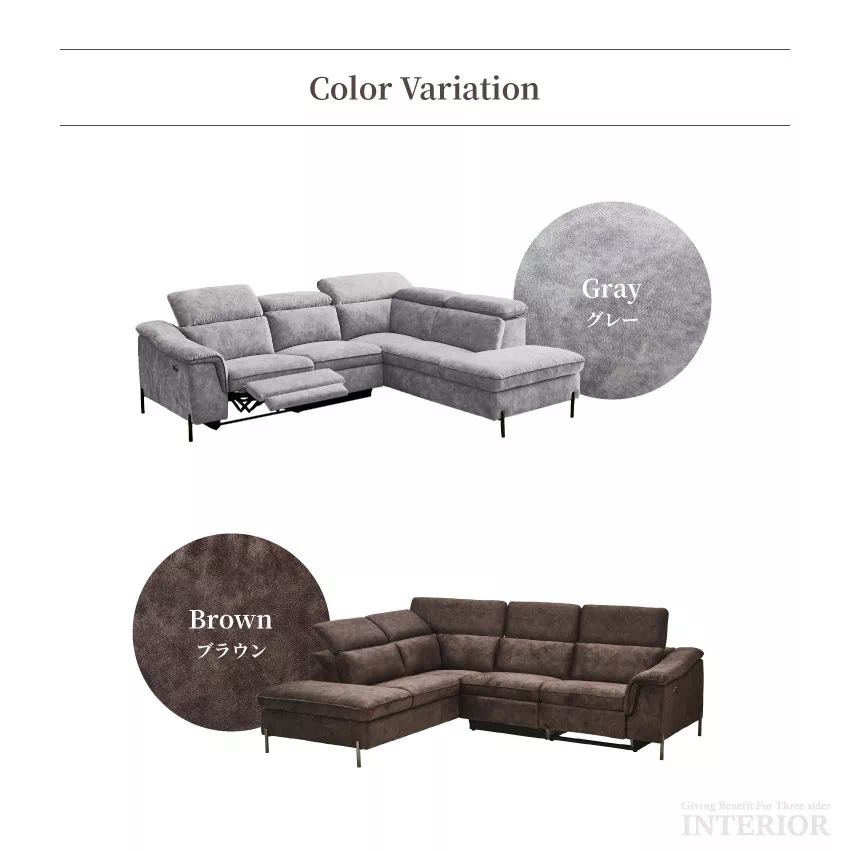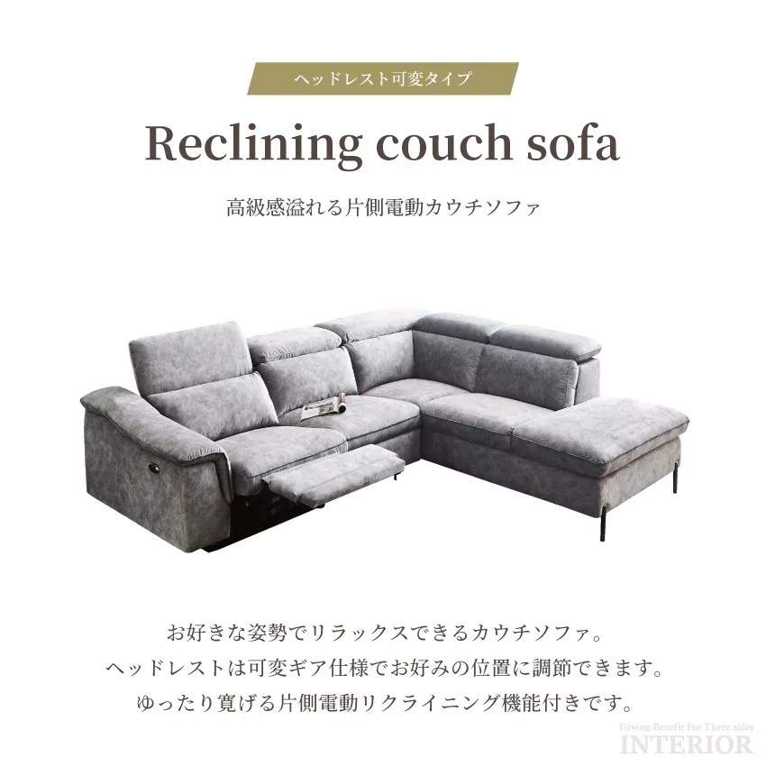 | 当ストアこだわりの片側電動リクライニングソファです。ヘッドレスト可変タイプ、ハイバック対応のコーナーカウチで、首までしっかりと支えてくれます。濃淡を生かしたスウェード調の生地が特徴的で、ずっと触れていたくなる優しい肌さわりです。ボタン1つで簡単にリクライニングが可能。またUSBポート付きなので、わざわざ移動することなく、スマホやゲーム機の充電ができます。 |