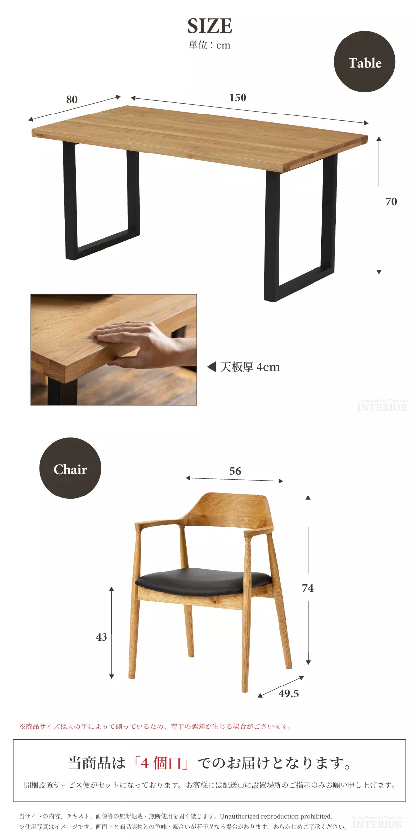 | テーブル:W150×D80×H70cm(天板厚4cm) チェア:W56×D49.5×H74(SH43)cm |