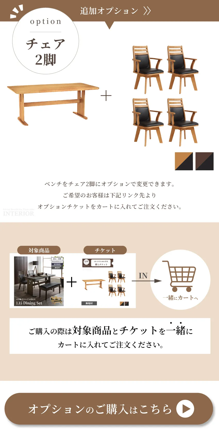 | 無垢材を使用したダイニング4点セット。細部まで丁寧に仕上げた、美しいデザインと快適な座り心地。家に帰りたくなるような、温かみのある食卓をご提供します。テーブルは、丸みのある優しいデザインで、小さなお子さんがいても安心です。W135×D80cmのテーブル、家族4人でも十分な広さを確保しました。食卓を囲んだ家族団らんの時間に、ぴったりなサイズ感です。回転式で立ち座りしやすいチェアが2脚セットになっています。肘掛部分も丸みがあるデザインで、掴みやすいフォルムです。安定した座り心地ですので、ゆったりとくつろいでください。シンプルなデザインのベンチ、背もたれがないのでお部屋もスッキリした印象に。置くだけで、カフェの様な雰囲気を演出してくれます。座れるだけでなく、ちょっとした荷物置きとしても活躍します。 |