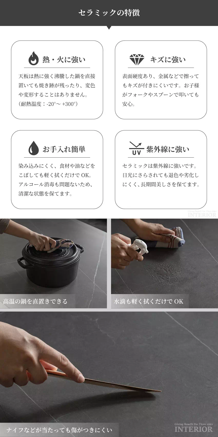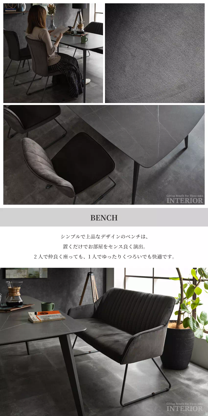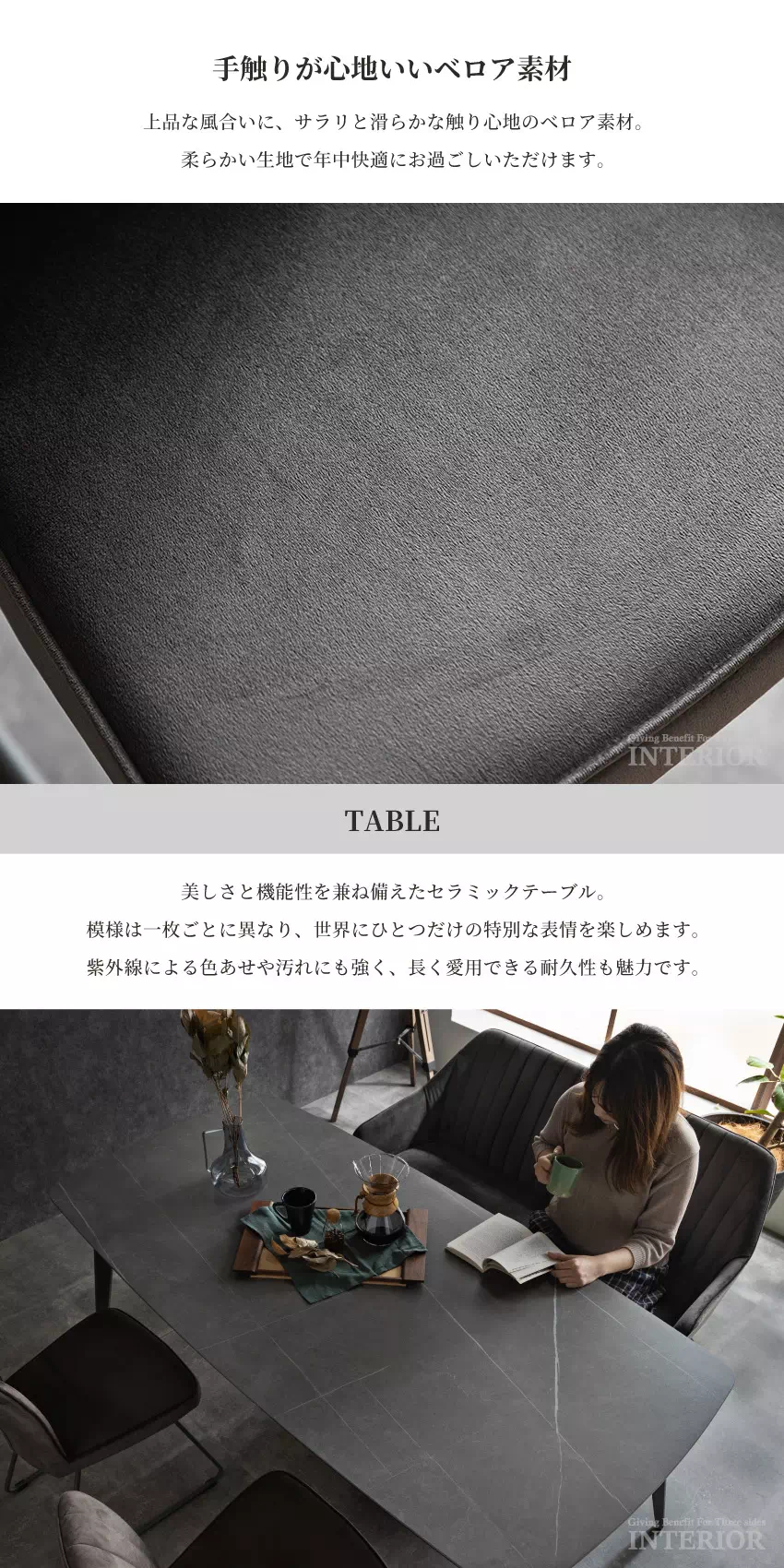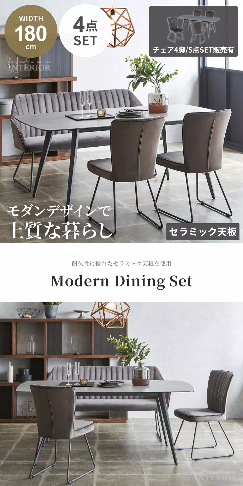 | セラミック天板のモダンなダイニングセットです。セラミック天板は熱やキズに強く、汚れや水滴も染み込みにくいためお手入れが簡単です。また、紫外線での劣化や変色も起こりにくい素材です。チェアとベンチはシックなスチールと光沢感のあるベロア生地でモダンに仕上げられています。 |