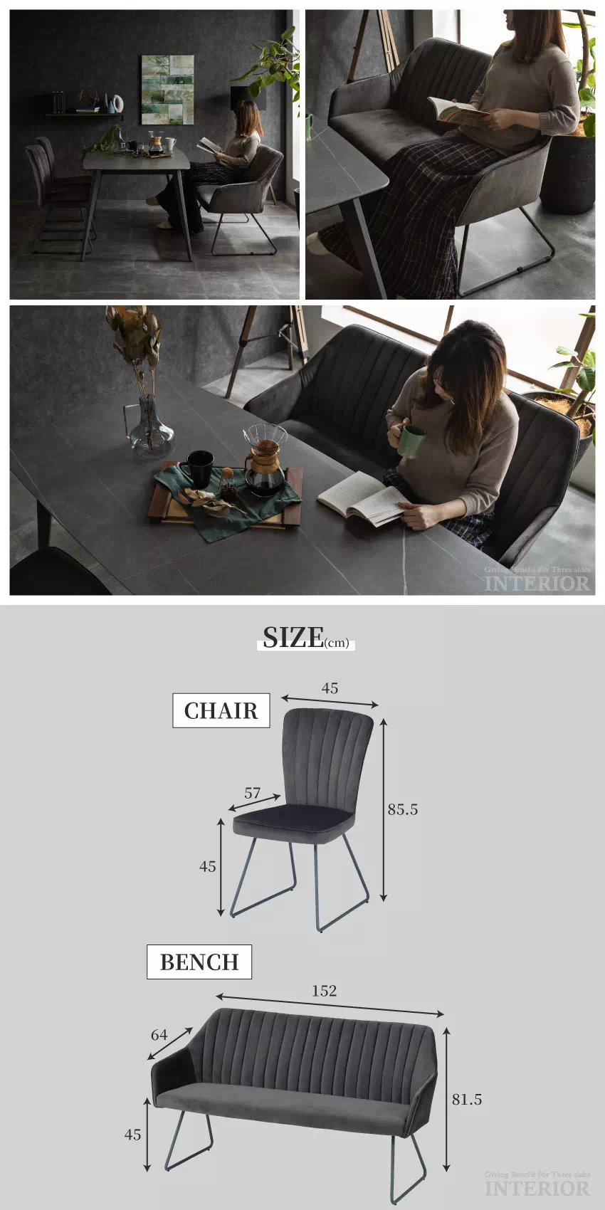 | テーブル:W180×D90×H72(cm) チェア:W45×D57×H85.5 SH45(cm) ベンチ:W152×D64×H81.5 SH45(cm) |