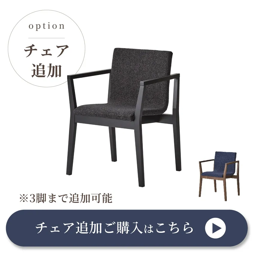| <テーブル>天板:メラミン化粧板/天板面材:ウォールナット無垢/脚:スチール <チェア>フレーム:ウォールナット無垢/座面:ファブリック生地(バトン)/塗装:ウレタン塗装 |