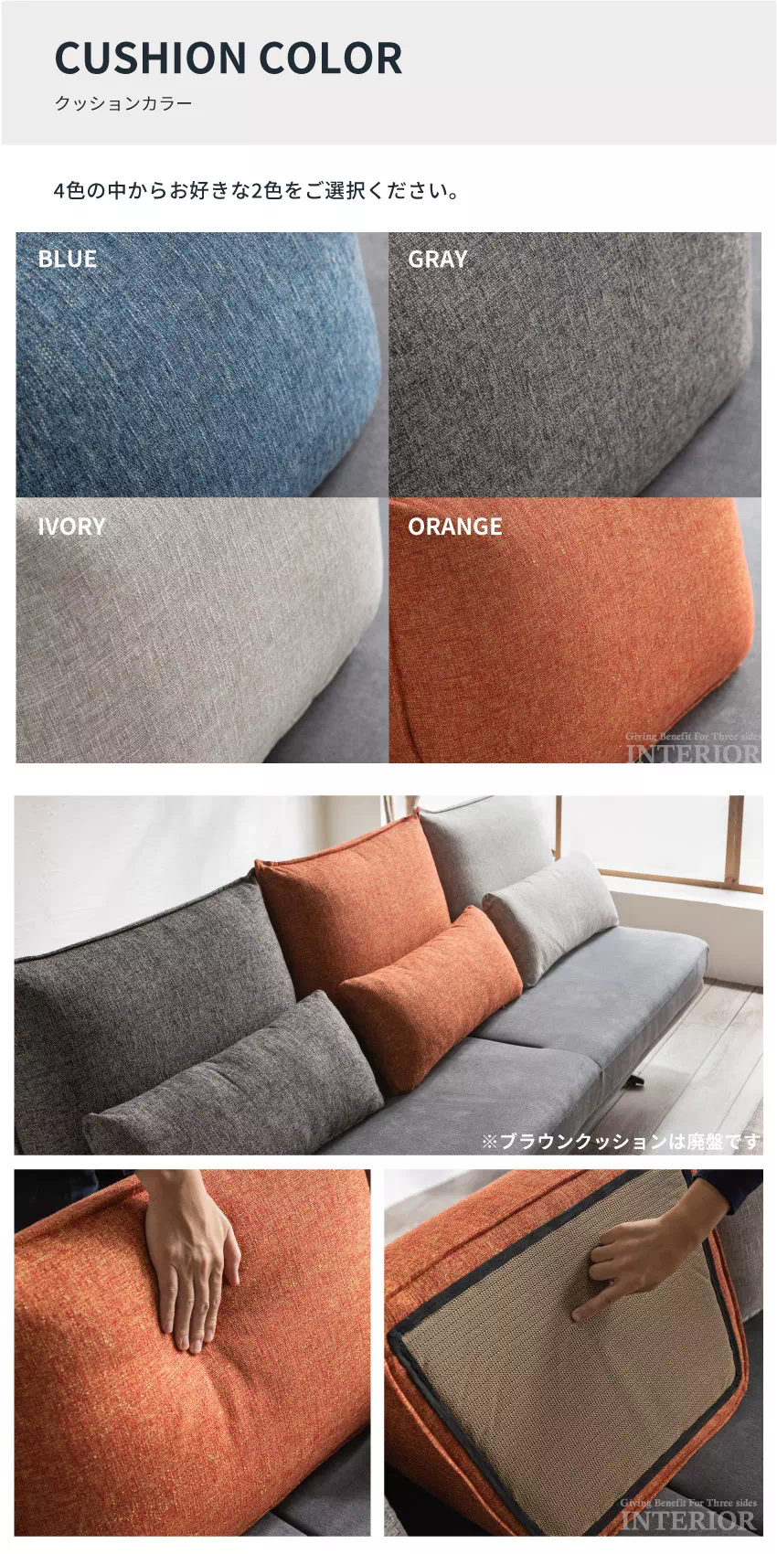 背もたれのクッションを、5色から選べるおしゃれな3Pソファです。
