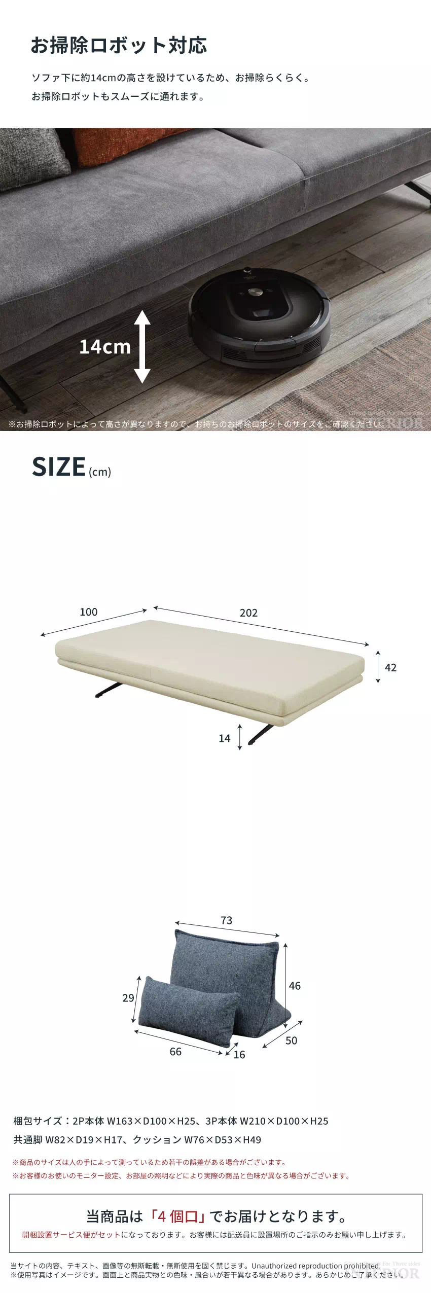 | 3P本体:W202×D100×H42 cm クッション(大):W73×D50×H46 cm クッション(小):W66×D16×H29 cm 梱包サイズ:W210×D100×H25、脚 W82×D19×H17、クッション W76×D53×H49 |