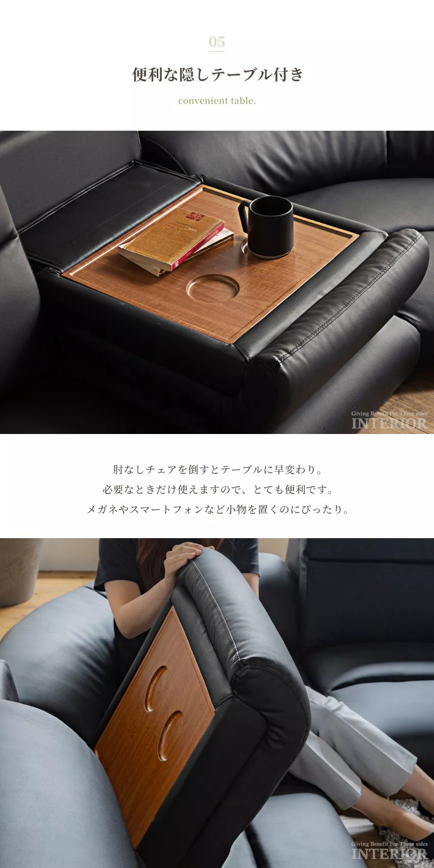 | まるで座椅子に座っているかのような安定感あるローソファ。高さがないため、お子様やペットのいるご家庭にもおすすめです。冬はコタツ用のソファとしても使用でき、年中お使いいただけます。座面・背面ともに適度な弾力があり、沈み込みすぎず体をしっかりサポート。さらにハイバック仕様+ワイドなひじ掛け付きで、より快適にお過ごしいただけます。ソファがそれぞれ独立したセパレート型となっているため、自由度の高いレイアウトが楽しめます。隠しテーブル付きでスマートフォンや飲み物などリラックスタイムに欠かせないアイテムを手元に置いておけます。 |