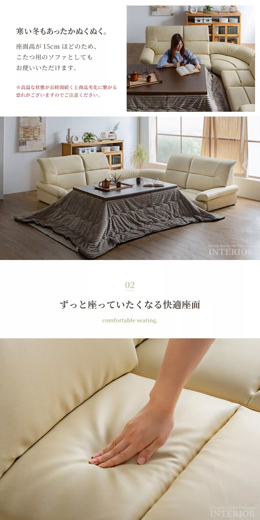 座面高が15cmほどのため、こたつ用のソファとしてもお使いいただけます。