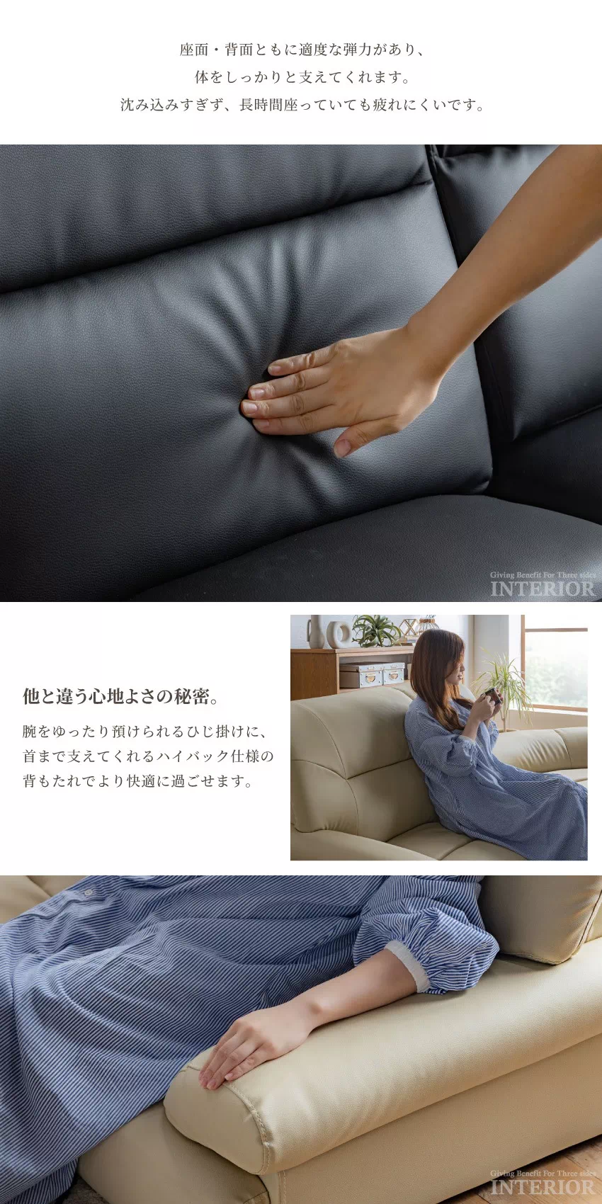 座面が広々としているため、足をのばしてくつろいだり、あぐらをかいたり、お好きな姿勢でリラックスできます。