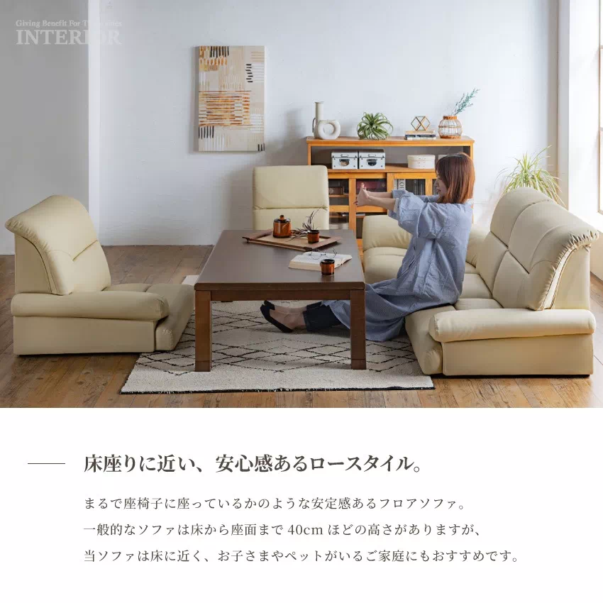 一般的なソファは床から座面まで40cmほどの高さがありますが、当ソファは床に近く、お子さまやペットがいるご家庭にもおすすめです。