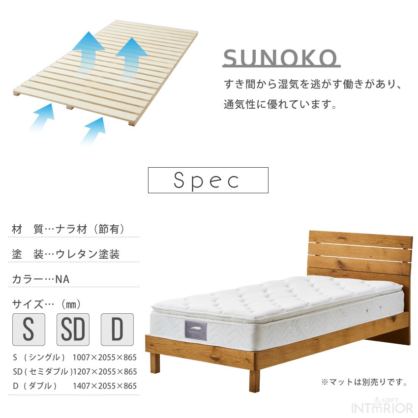 | ナラ材(節あり)、ウレタン塗装 ※マットレスは別売りになります。 |