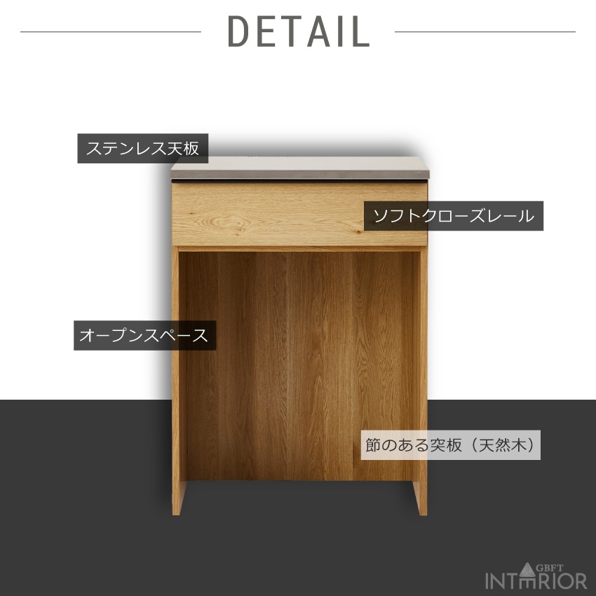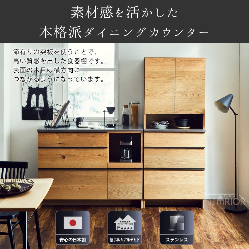 | 節あり突板を使用した存在感あるキッチンカウンターです。ステンレス天板に引き出し、さらにダストボックスなどを置けるオープンスペースを備えています。引き出しはソフトクローズレール仕様で、ゆっくり閉まるから安全。また天板にはサビや汚れに強いステンレスを採用しています。当商品は国内にて生産しておりますので、安心してお使いいただけます。 |