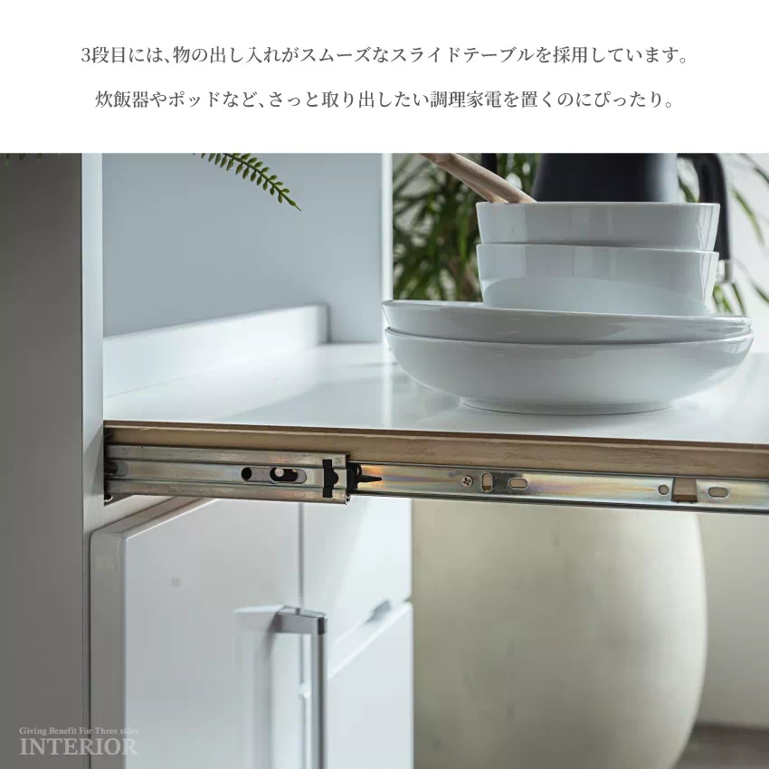 | キッチンに開放感を与える真っ白なレンジ台。美しい鏡面ホワイトでキッチンが清潔感のある明るく爽やかな印象に。最下段は開け閉めが楽に出来るスライドレール付きの引き出し。500mlのペットボトルが立てて入れられる深めサイズに取っ手は使いやすい細長の使用です。 |