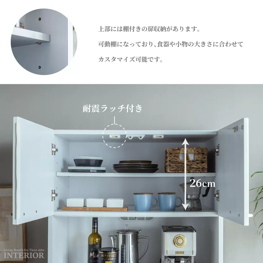 | 材質/MDF:引出箱組・移動棚・ネジダボ エナメル塗装磨きツヤ100% 飛散防止効果フィルム加工ガラス使用 上扉耐震ラッチ付・日本製 |