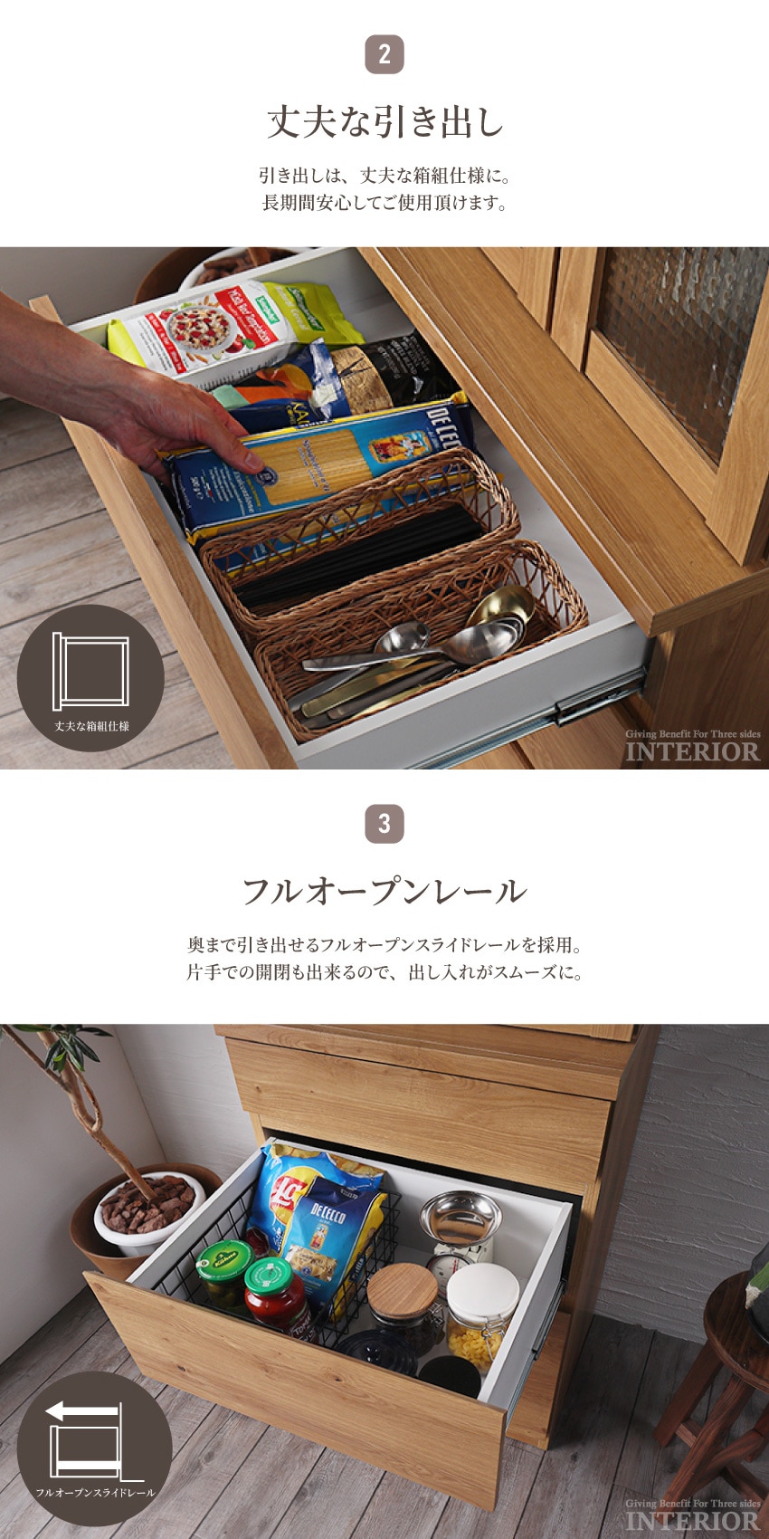 | お部屋に馴染みやすいシンプルなデザインに、大容量収納を備えたキッチンボード。引き出しや戸棚など、キッチン周りの小物をたっぷり収納出来ます。豊富なラインナップを揃えておりますので、お好きなサイズをお選びいただけます。サイズ違いのアイテムを組み合わせて使用することで、統一感のあるオシャレな空間を作れます。安心安全な国産品!安心してご使用ください。 |
