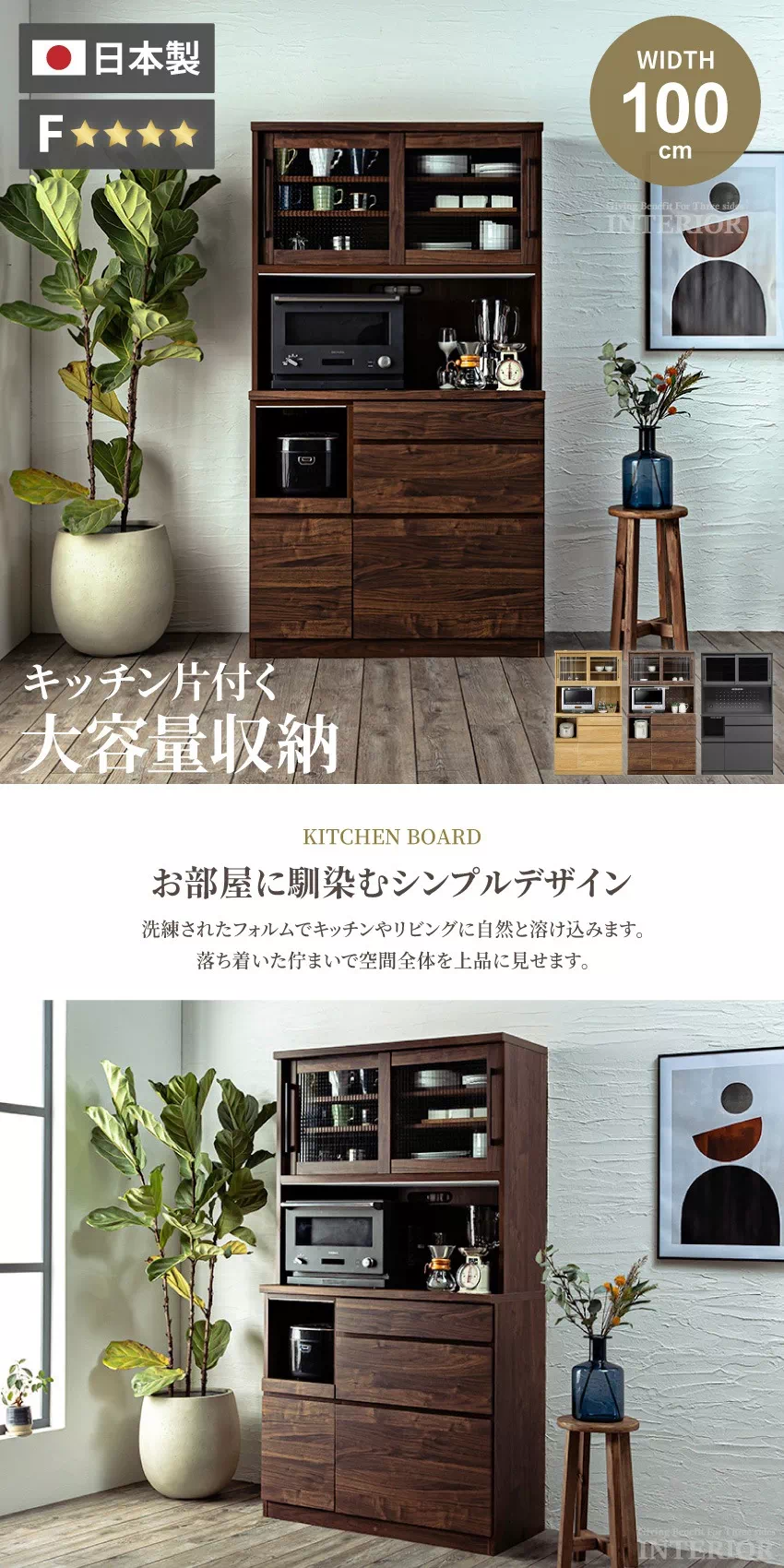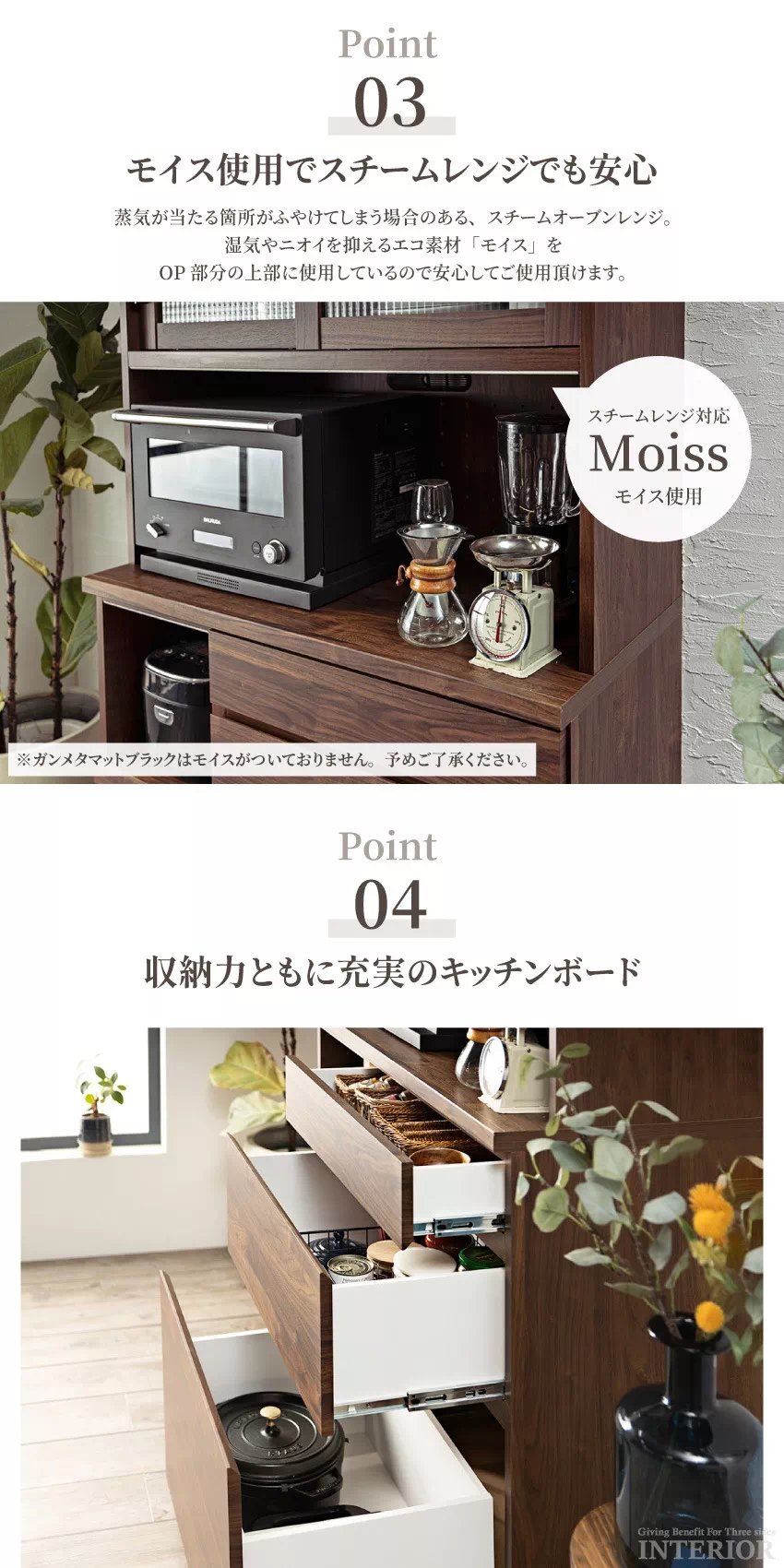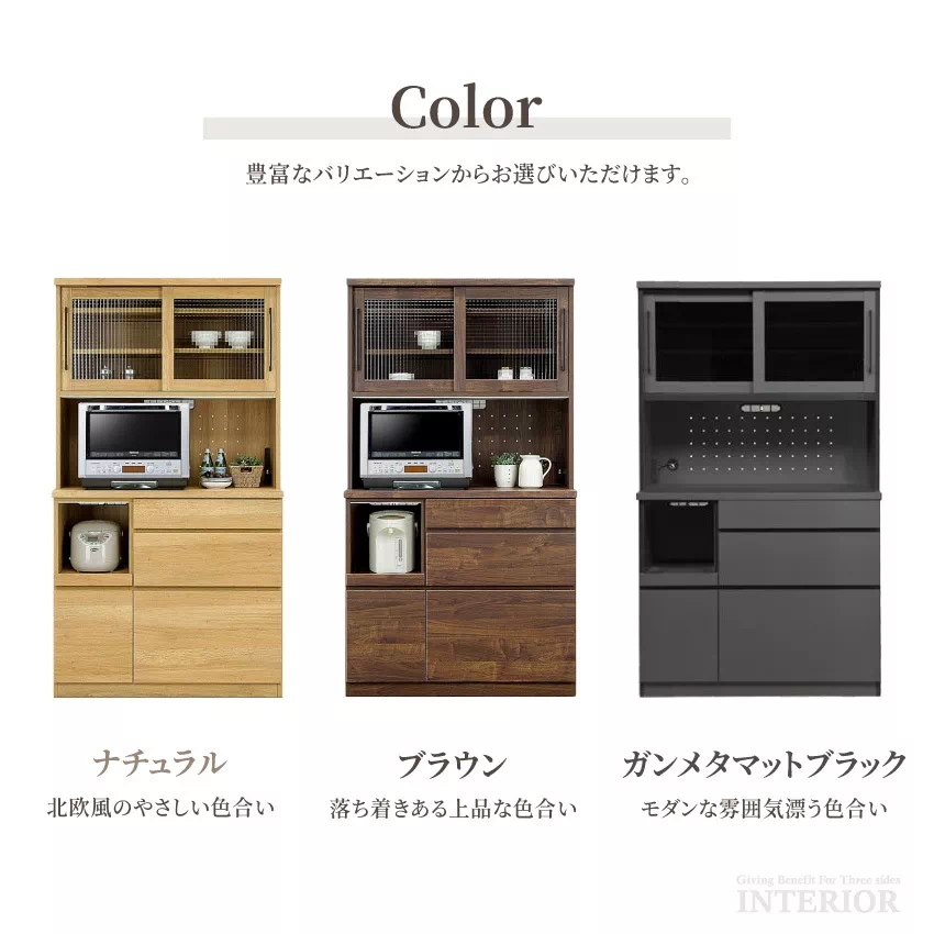 | お部屋に馴染みやすいシンプルなデザインに、大容量収納を備えたキッチンボード。引き出しや戸棚など、キッチン周りの小物をたっぷり収納出来ます。豊富なラインナップからお好きなサイズをお選びいただけます。安心安全な国産品!安心してご使用ください。湿気やニオイを抑えるエコ素材「モイス」をOP部分の上部に使用しているのでスチームオーブンレンジでも問題なくご使用頂けます。(※ガンメタマットブラックはモイスがついておりません。) |