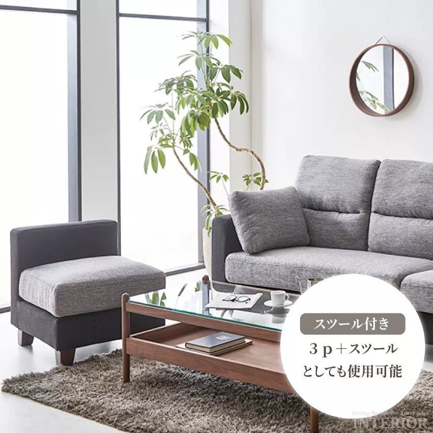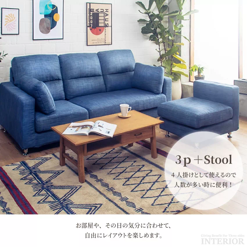 | ファブリック素材の3人掛けカウチソファ。切り離して3P+スツールとしてもご使用いただけます。左右自由にスツールと3Pソファを組み合わせることが出来るので、自由にレイアウトを楽しめます。豊富なカラーラインナップから、お好みの色をお選びください。脚もスタイリッシュなスチール脚とナチュラルな木製脚の2種類から選択可能です。 |
