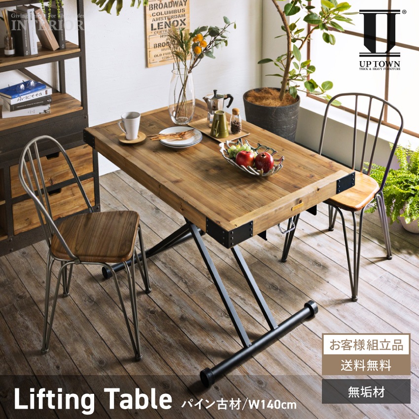 昇降式テーブル 昇降テーブル ダイニングテーブル 幅140cm センターテーブル リフティングテーブル 北欧 おしゃれ パイン材 ヴィンテージ 西海岸 インダストリアル リビングテーブル ガス圧式 ガス圧式昇降テーブル UP330 PULLEY プーリー UP TOWN FURNITURE