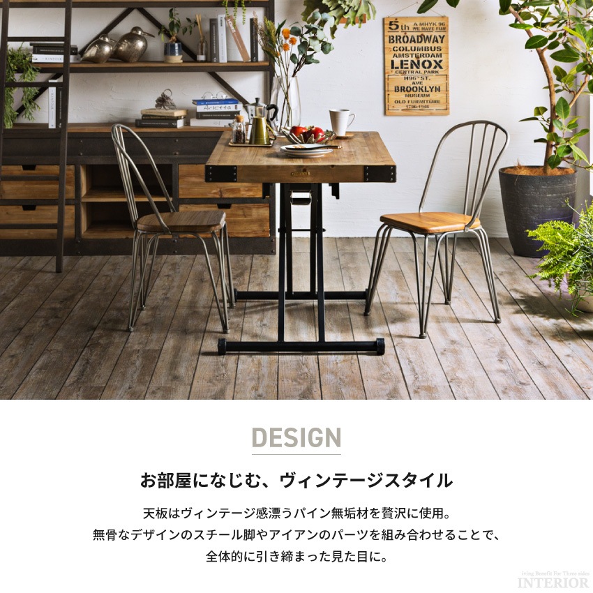 | 「THICK & HEAVY」をコンセプトに、時代に淘汰されてきた重厚感と存在感ある家具で、使う人々の生活にアクセントとなるコト・モノを発信するカジュアル・ビンテージ家具ブランド「UP-TOWN」自慢のリフティングテーブル。無段階調節機能付きだから、お好きな位置で調節いただけます。パイン無垢材を贅沢に使用し、スチール脚を組み合わせてヴィンテージライクなデザインに仕上げました。 |