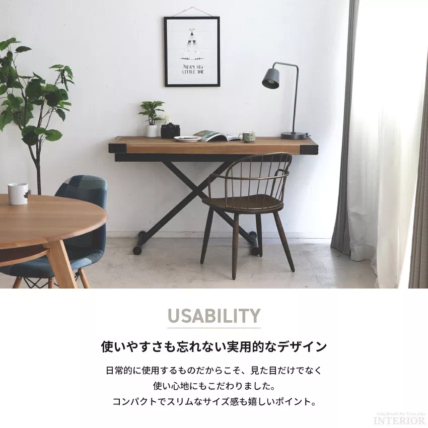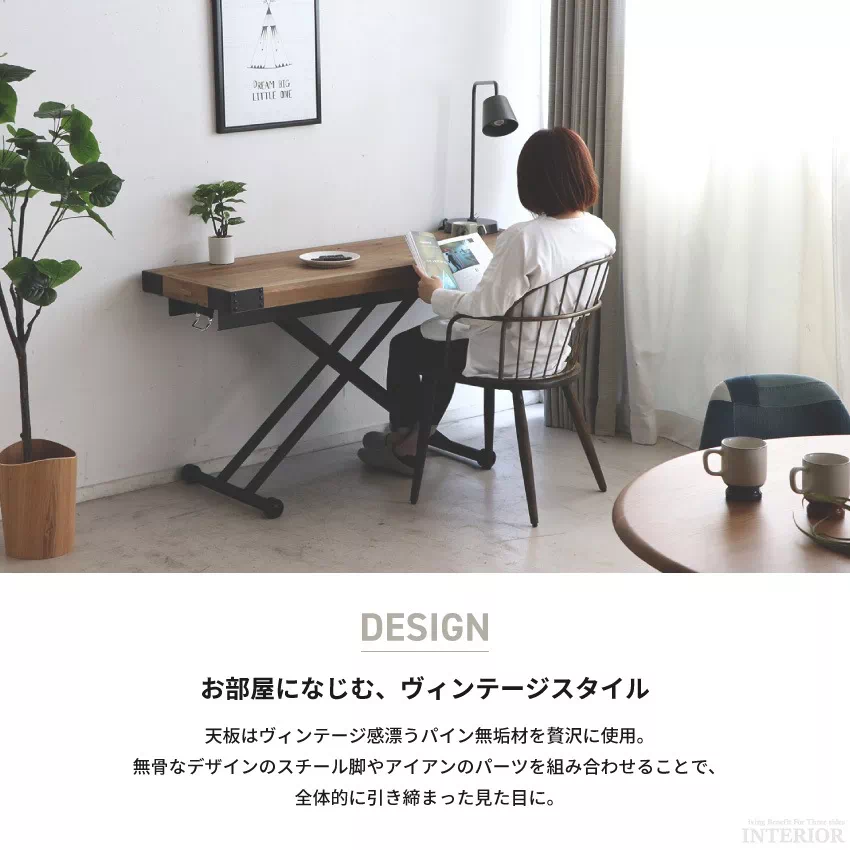 | 「THICK & HEAVY」をコンセプトに、時代に淘汰されてきた重厚感と存在感ある家具で、使う人々の生活にアクセントとなるコト・モノを発信するカジュアル・ビンテージ家具ブランド「UP-TOWN」自慢のリフティングテーブル。無段階調節機能付きだから、お好きな位置で調節いただけます。パイン無垢材を贅沢に使用し、スチール脚を組み合わせてヴィンテージライクなデザインに仕上げました。 |