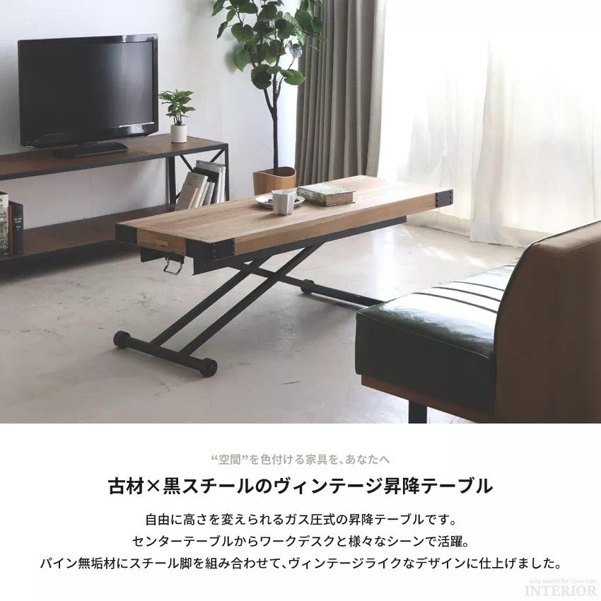 昇降式テーブル 昇降テーブル スリム センターテーブル ダイニングテーブル 幅140cm リフティングテーブル 北欧 おしゃれ パイン材 ヴィンテージ 西海岸 リビングテーブル ガス圧式 ガス圧式昇降テーブル UP330 PULLEY プーリー UP TOWN FURNITURE GB-INTE-0744