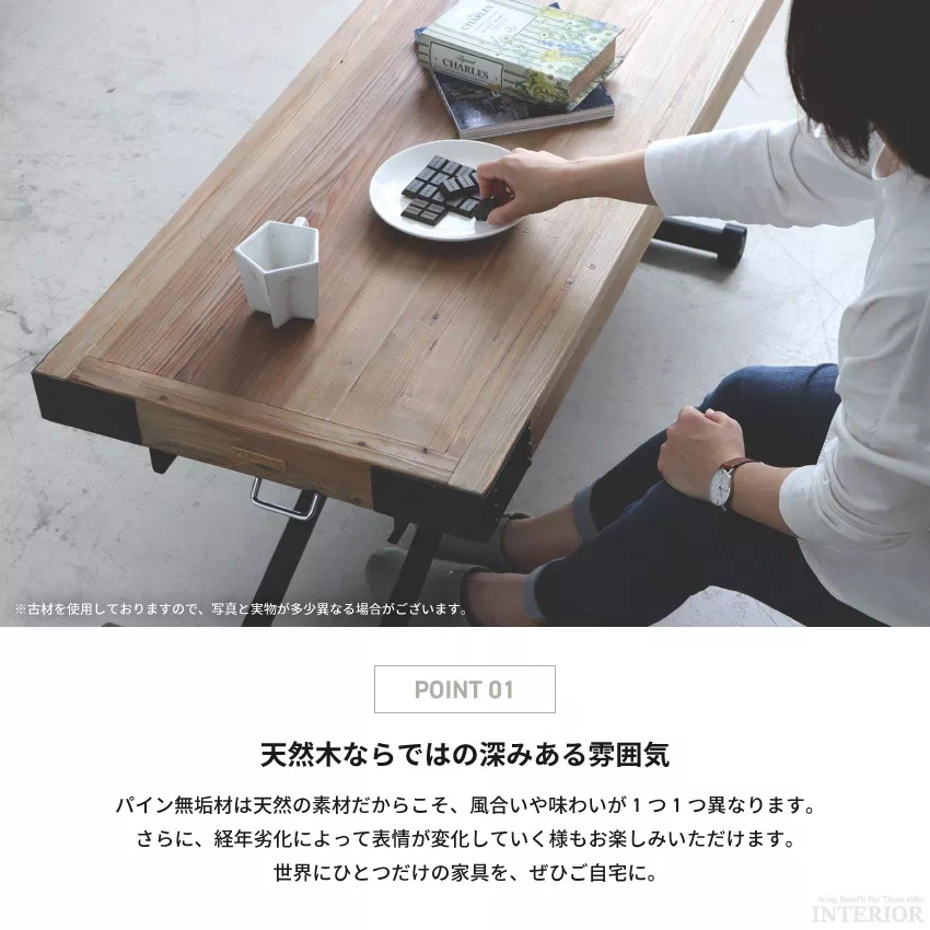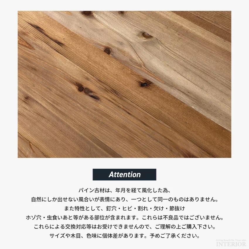 | 天板:パイン古材(ワックス塗装) 脚:アイアン(粉体塗装) パイン古材は、年月を経て風化した為、自然にしか出せない風合いが表情にあり、一つとして同一のものはありません。また特性として、釘穴・ヒビ・割れ・欠け・節抜け・ホゾ穴・虫食いあと等がある部位が含まれます。これらは不良品ではございません。これらによる交換対応等はお受けできませんのでご理解の上ご購入下さい。サイズや木目、色味に個体差があります。予めご了承ください。 |