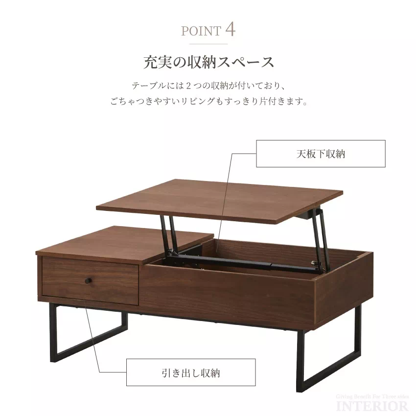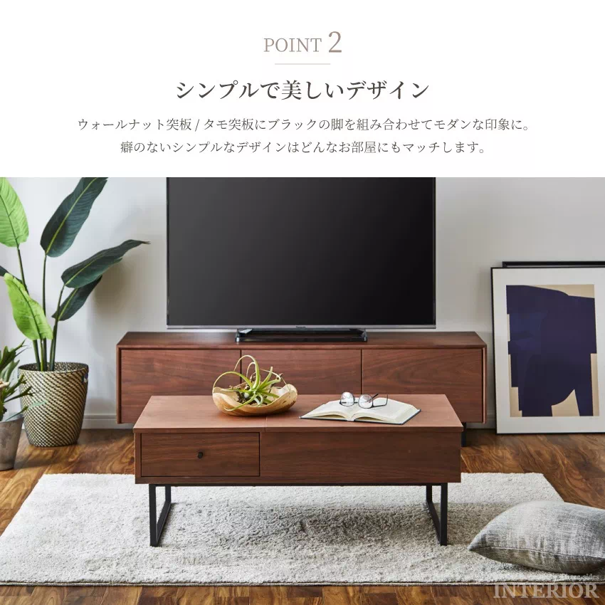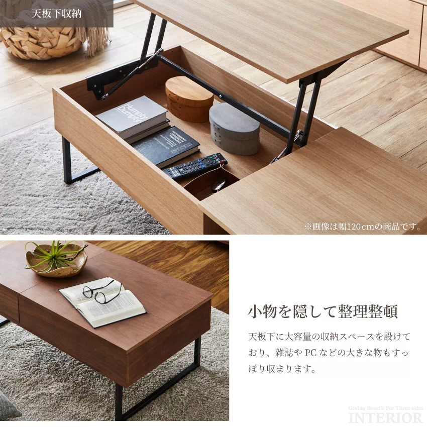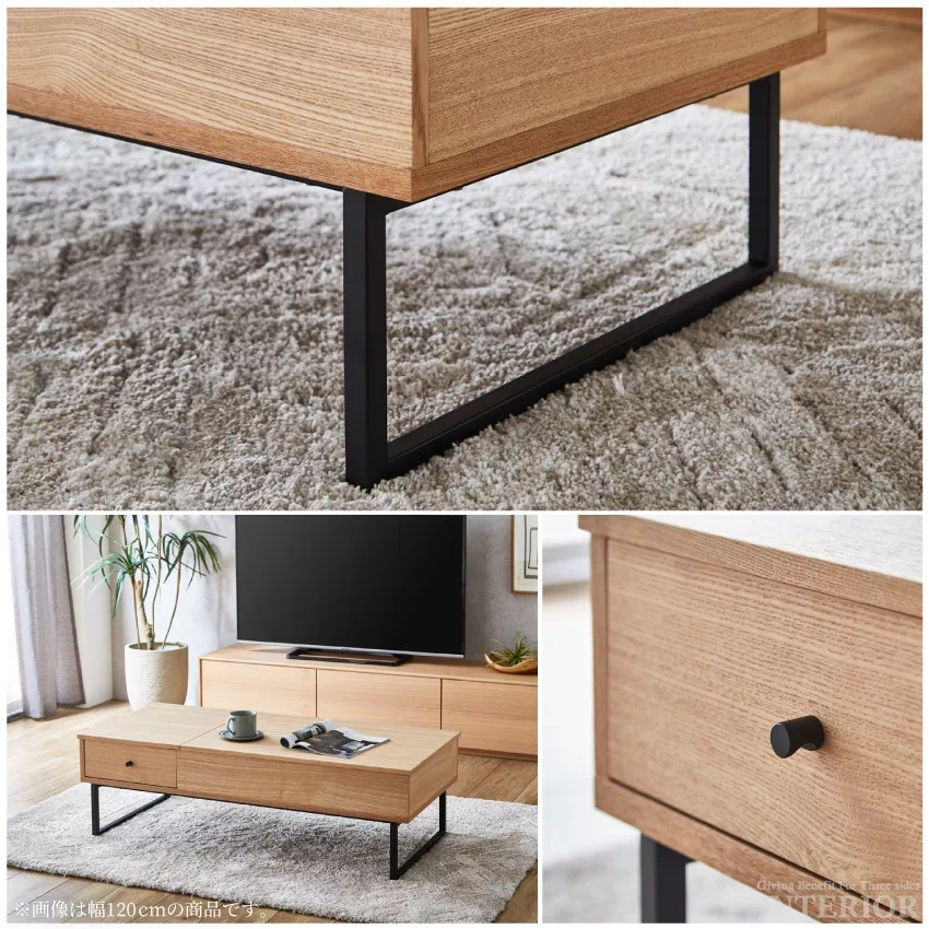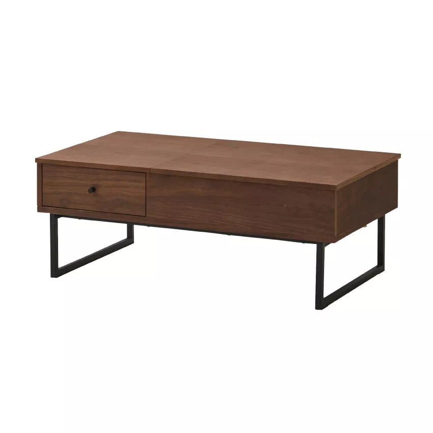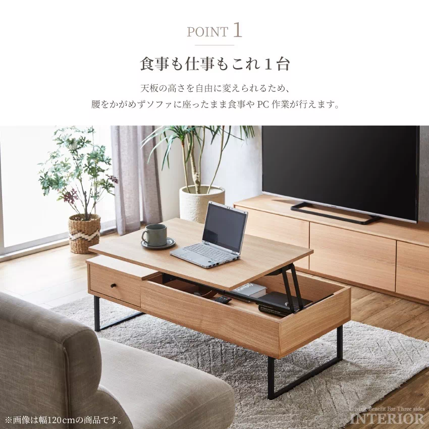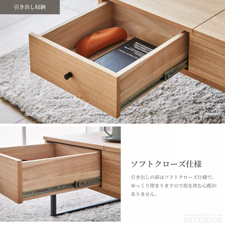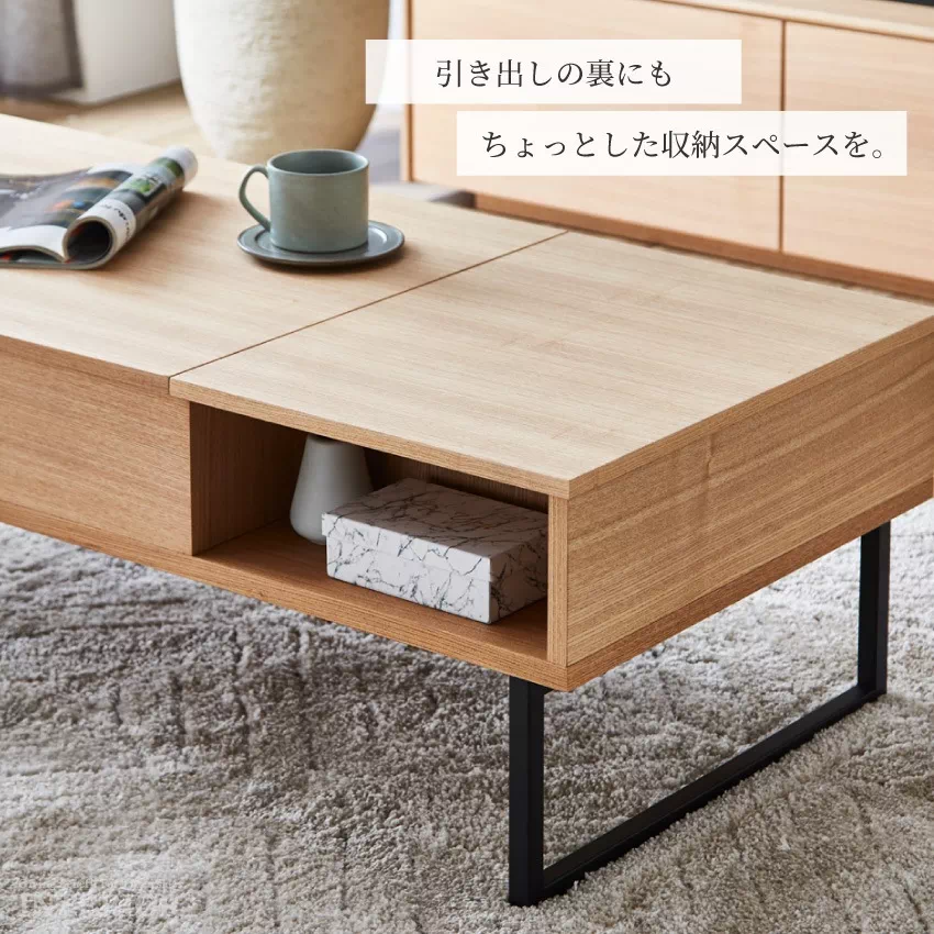| シーンに合わせて自由に高さが変えられるリフトアップテーブル。そのままの高さだとローテーブルに、軽く上にあげるとデスクに変化します。天板下には雑誌やPCがしまえる収納がついており、テーブルがすっきり片付きます。サイドにも引き出し収納が1つ付いています。素材にはウォールナット、タモ突板を使用し、温かみある雰囲気に仕上げました。 |