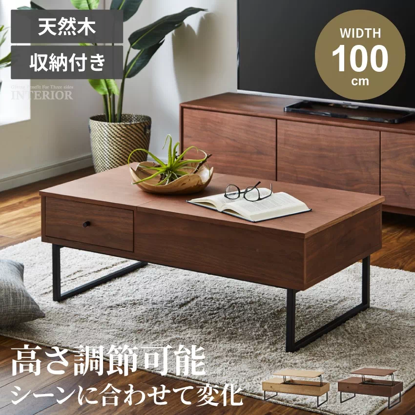 昇降テーブル 幅100cm ブラウン ナチュラル おしゃれ リビングテーブル センターテーブル リフトアップテーブル 高さ調節テーブル 高さ調整 ローテーブル ウォルナット タモ 突板 収納 引き出し デスク 突板 天然木 テレワーク 新生活 GB-INTE-0923