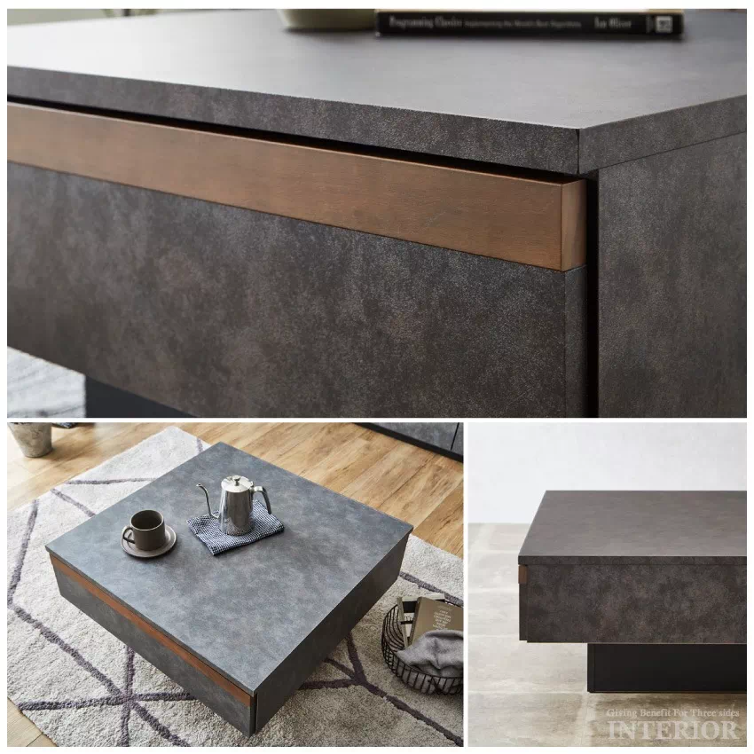 | コンクリート調のデザインが非日常を演出。ホテルライクなインテリアが叶うセンターテーブルです。直線的でフラットなデザインは生活感を抑え、お部屋を洗練された印象に。デザインだけでなく機能性にもこだわり、物がたっぷり入る引き出し収納が両サイドについています。引き出しはフルオープンレール仕様でスムーズに開け閉めできます。カラーはダークグレーとライトグレーの2色展開です。 |
