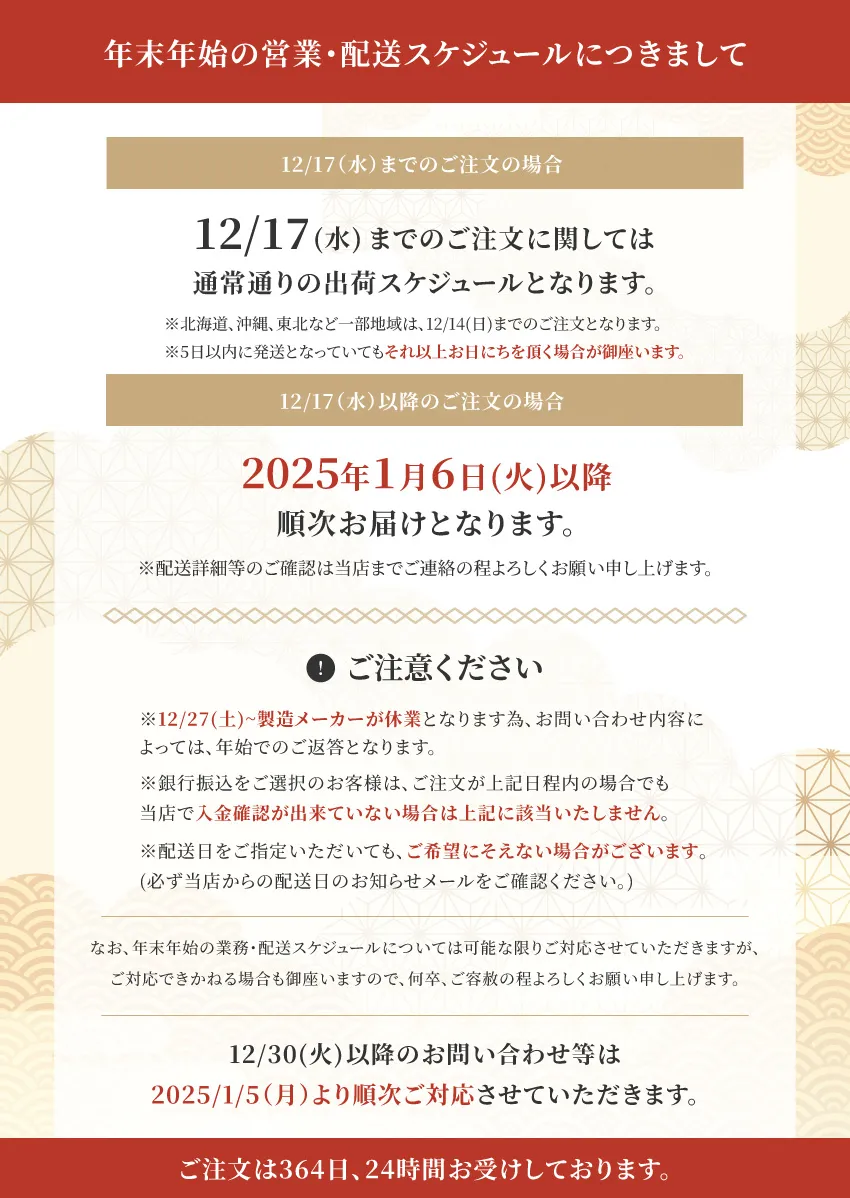- ※上記までにお支払いが完了しているご注文のみが対象です。
