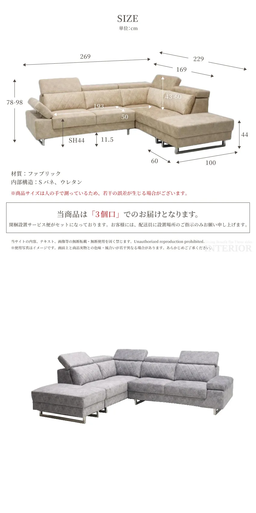 カウチソファ 幅224cm 3人掛け ベージュ ブラウン おしゃれ 左カウチ ファブリック ヘッドレスト クッション付き リビング ひっかき傷に強い 傷つきにくい 北欧 モダン 新生活