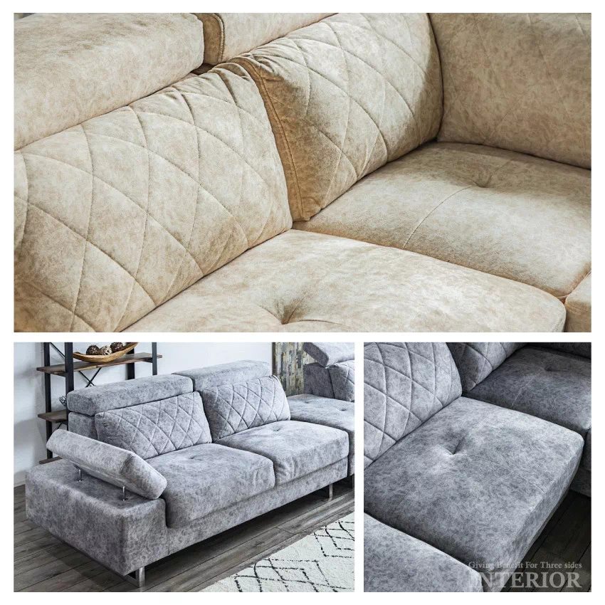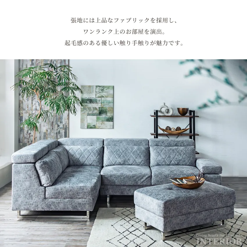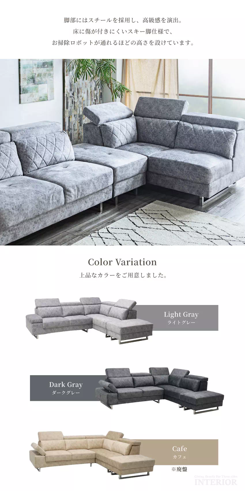 | ファブリックを採用した高級感溢れるカウチソファ。スツールが付属しており、お部屋やシーンに合わせて自由にレイアウトを変えられます。ヘッドレスト・アームレストは角度調節が可能で、お好みの位置でリラックスいただけます。ソファ内部にはウレタンやSバネを使用しており、適度な弾力で体をしっかり支えてくれます。足元には上品なスチールを採用。床が傷つきにくいスキー脚仕様でお掃除ロボットが通れるほどの高さを設けています。カラーはライトグレー、ダークグレー、カフェの3色展開。 |