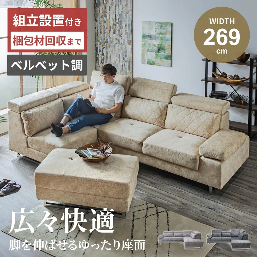 ソファー L字 おしゃれ 3人掛け スツール付き カウチソファ コーナー 4人掛け リビングソファ ハイバック ローバック 大型 レイアウト自由 ヘッドレスト アームレスト スチール脚 ケラー バニラ 新生活 GB-INTE-1276