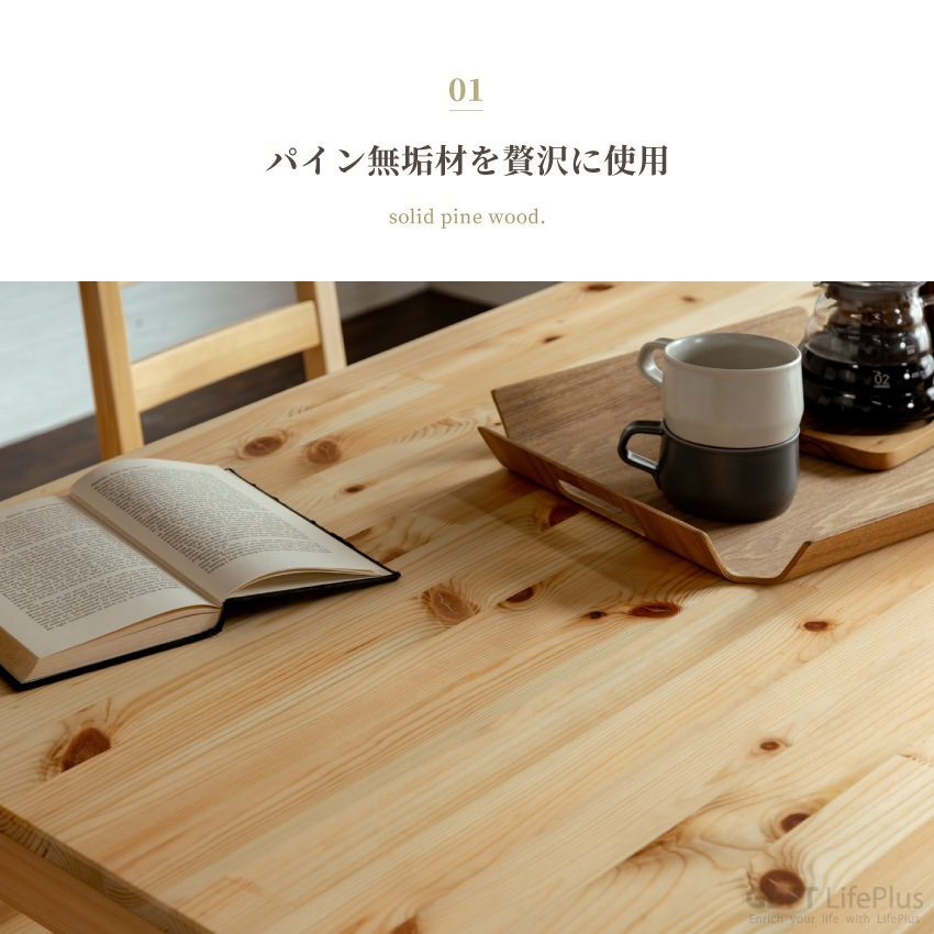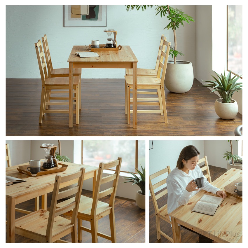 | パイン無垢材を贅沢に使用したダイニングセット。天然木ならではの優しい雰囲気と心地よい手触りが魅力です。UV塗装を施しているため、キズや汚れに強く簡単にお手入れしていただけます。(※無垢材を使用しているため、木目や節など商品によってバラつきがございます)素材の良さが際立つシンプルなフォルムは、どんなお部屋にも馴染みます。天板は幅120×奥行75cmで狭すぎず広すぎず、家族4人で使うにはちょうどいいサイズ感。チェアには横揺れを防止する補強金具がついており、安定感ある座り心地です。 |