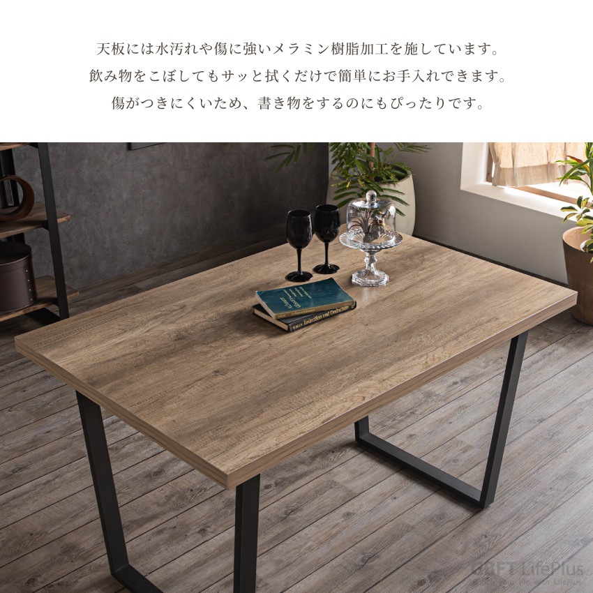| シンプルなデザインで幅広いシーンに活躍するダイニングテーブル。家族や友人と食事を囲んだり、ワーキングスペースとして使用したり、さまざまな用途にお使いいただけます。天板には水汚れや傷に強いメラミン樹脂加工を施しており、飲み物をこぼしても拭くだけでOK。お部屋に合わせて木目調とコンクリート調の2種類からデザインをお選びいただけます。 |