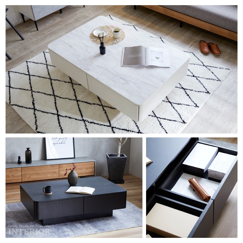 | リビング周りに溢れる小物をすっきり収納できる引き出し付きテーブル。合計4つの引き出しが付いており、文房具やリモコン、家電の取り扱い説明書など普段使うものをすべてリビングの中心にまとめておけます。天板にはメラミン素材を採用。水汚れや傷に強く、お手入れも簡単です。胴回りには突板を使用し、高級感あるデザインに仕上げました。カラーはお部屋に合わせて選べる4色展開です。 |