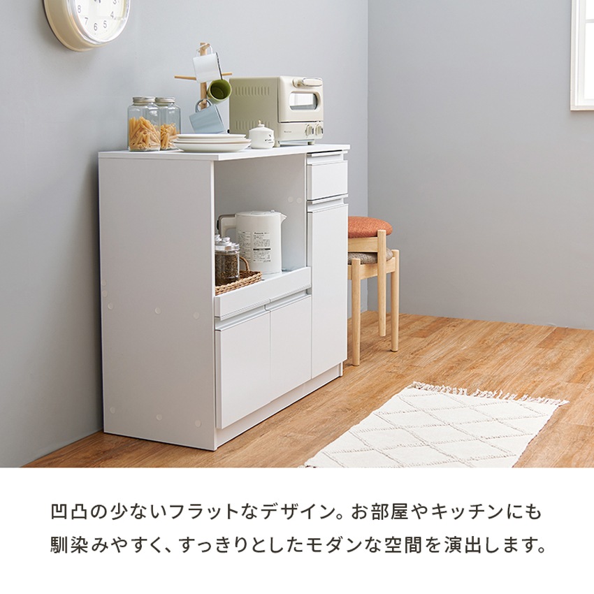| コンパクトながら多機能な収納が備わっているキッチンカウンター。扉収納やスライド棚、引き出しなどキッチン周りの小物をひとまとめにできます。スライド棚部分には2口コンセントが完備されているため、炊飯器や電子レンジなどを置くのにぴったりです。天板などは水や汚れに強いPVCを採用していますので、簡単にお手入れしていただけます。凹凸のないフラットデザインでモダンな印象に仕上げました。 |