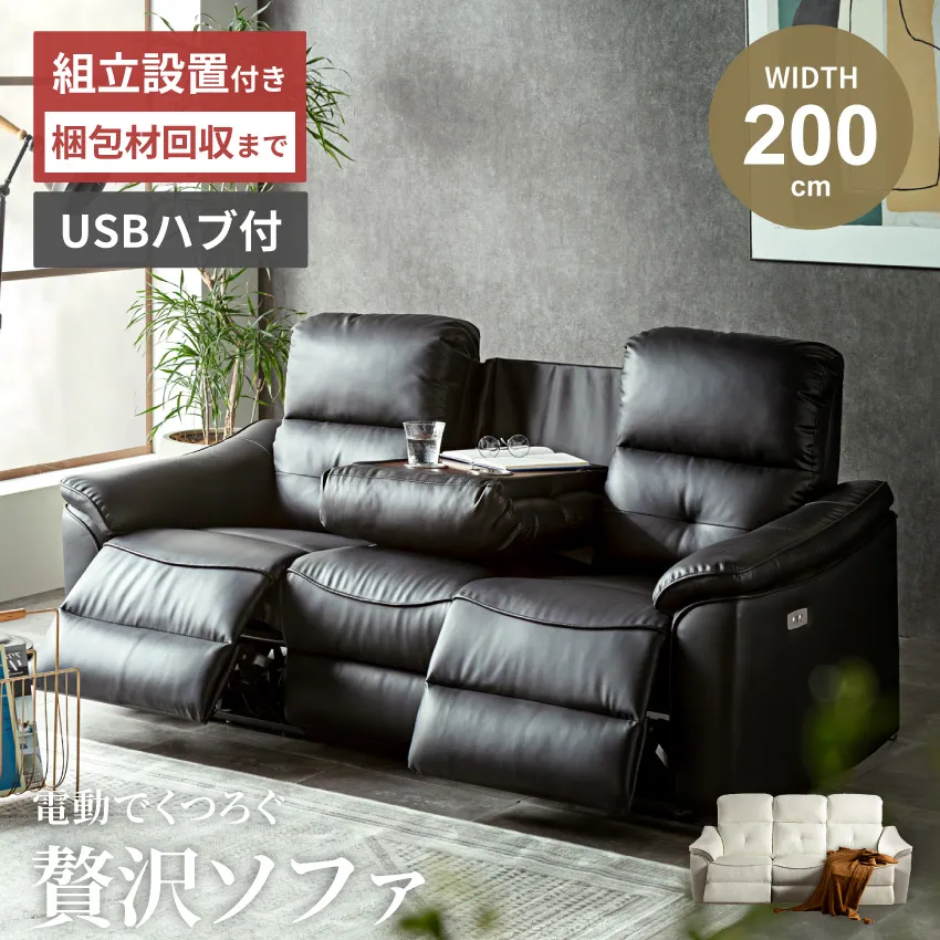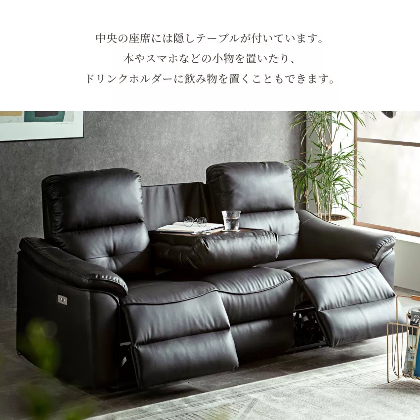 ソファー 3人掛け 電動リクライニング 北欧 おしゃれ おすすめ ホワイト ブラック PVC 2人掛け 電動 ハイバック 電動リクライニングソファー ソファ コンパクトテーブル付き リビングソファー 電動ソファー USB 合皮 センターテーブル 白 黒