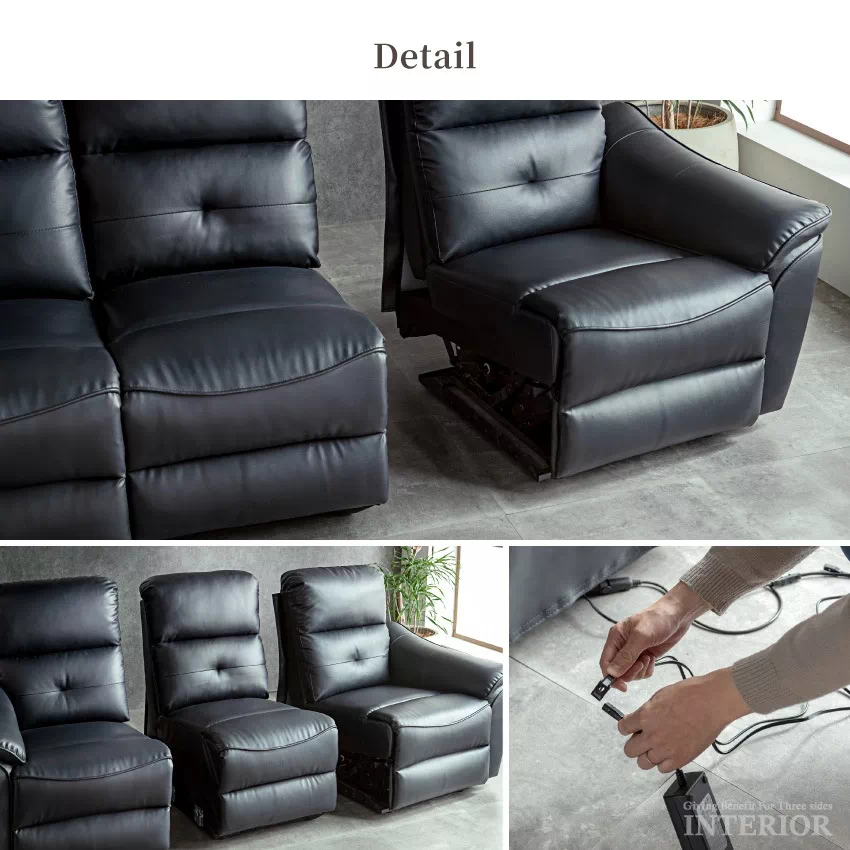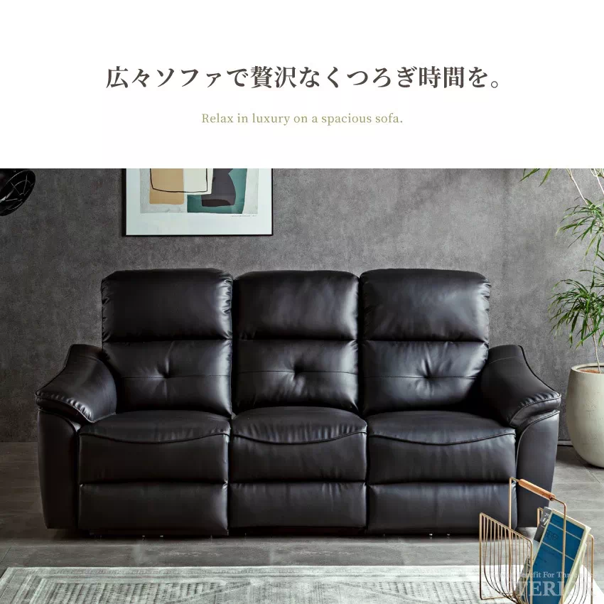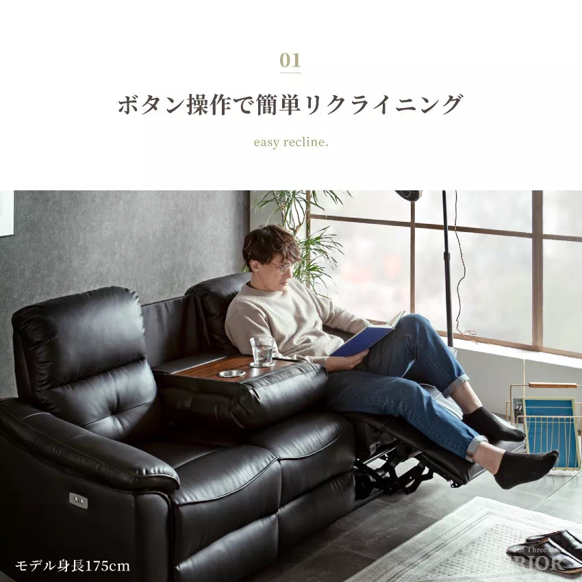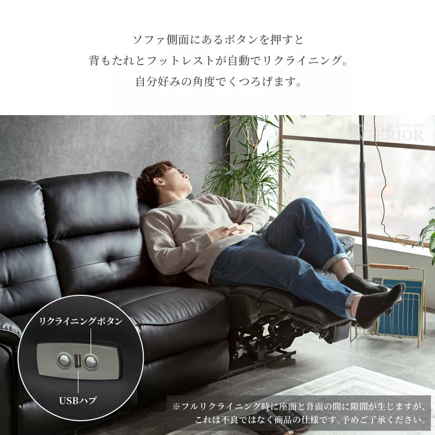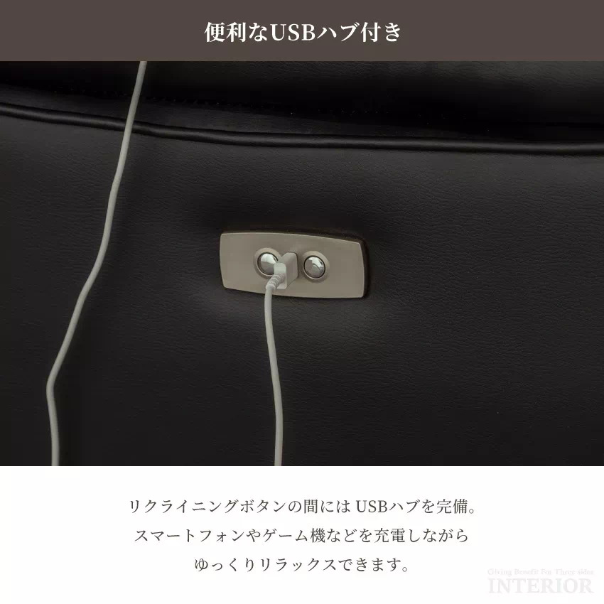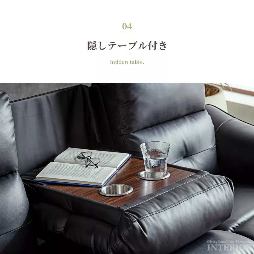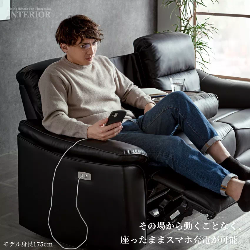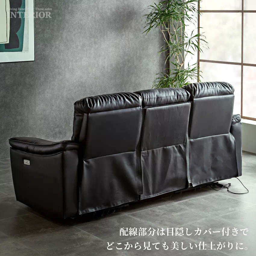 | 電動リクライニング機能が付いた贅沢な3人掛けソファ。側面に備えられたリクライニングボタンを押すと自動で背もたれとフットレストが動きます。お好みの位置に調節できるため、楽な姿勢でリラックスできます。ボタンの横にはUSBハブが付いており、スマートフォンやゲーム機などの充電が可能です。張地には傷や水に強いPVCを採用。上品なデザインに簡単なお手入れが魅力です。中央部の座席を倒すとサイドテーブルに早変わり。ドリンクホルダーが2つ付いており、グラついたり落下したりする心配がありません。 |