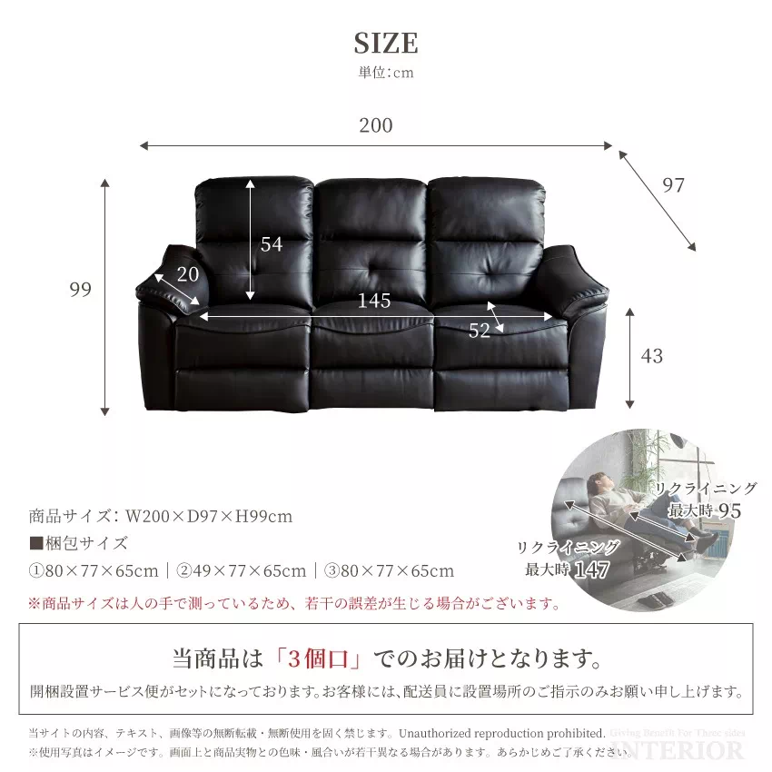 | W200×D97×H99cm 梱包数:3 80×77×65cm、49×88×65cm、80×77×65cm |