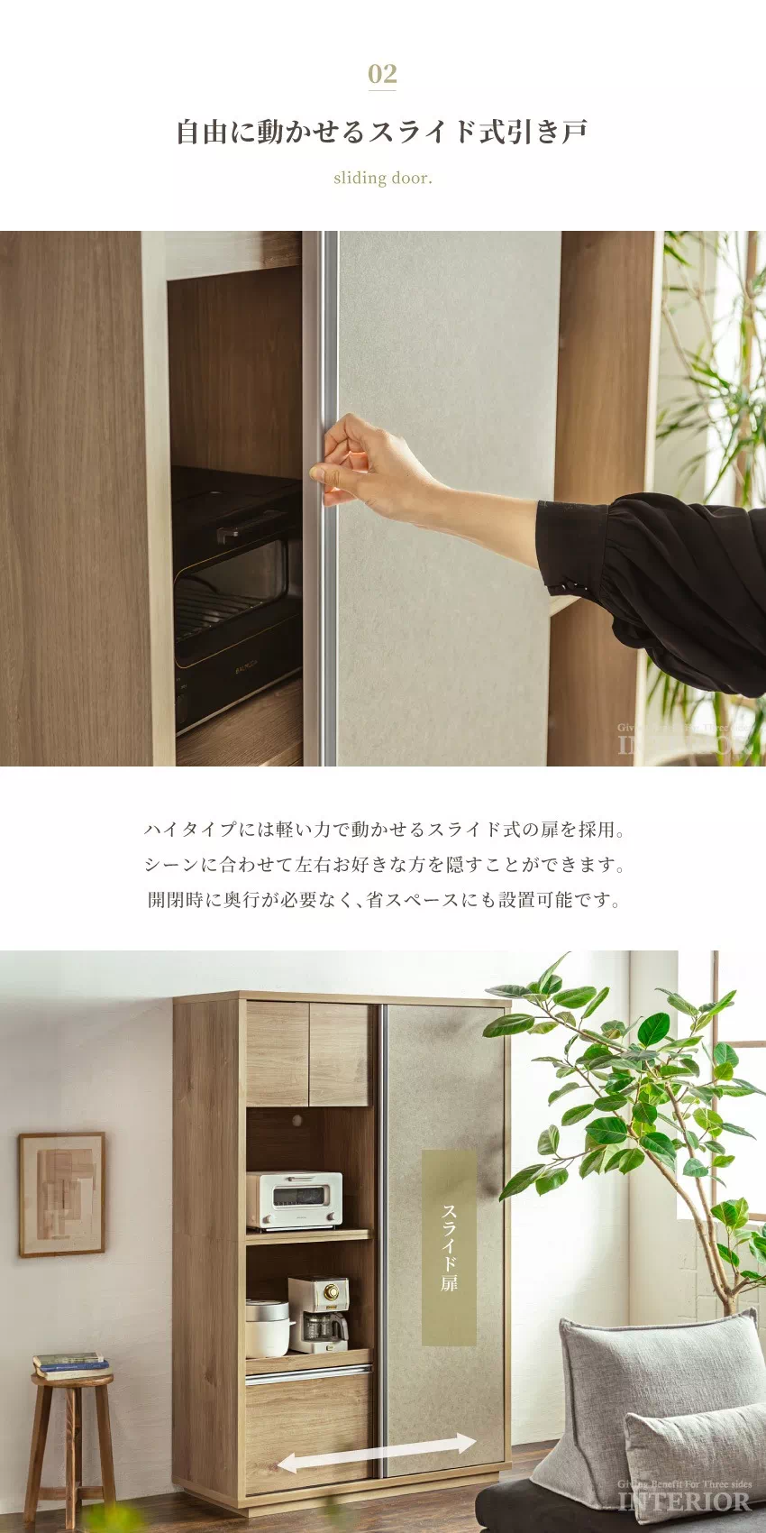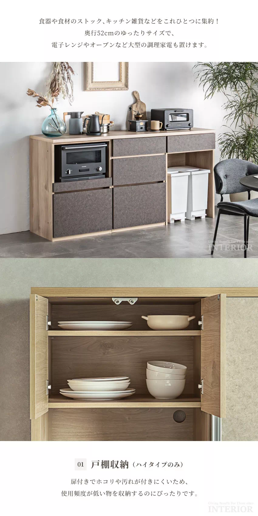 | 容量収納を備えたカップボード。2種類のサイズと2色のカラーをご用意しておりますので、キッチンにぴったりのものをお選びいただけます。引き出し収納や戸棚収納など充実の収納機能で、キッチン周りの物を1つに集約できます。 |